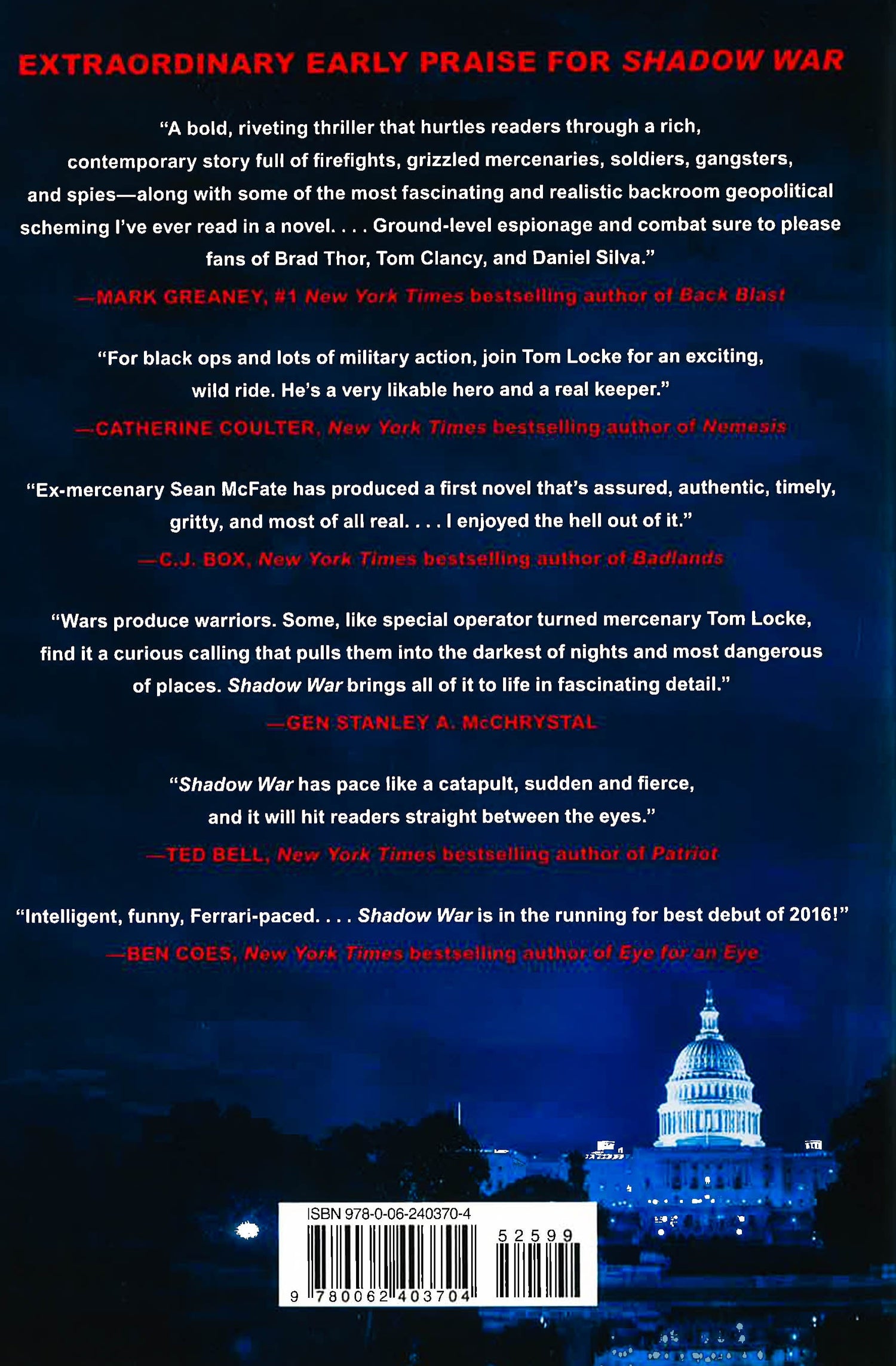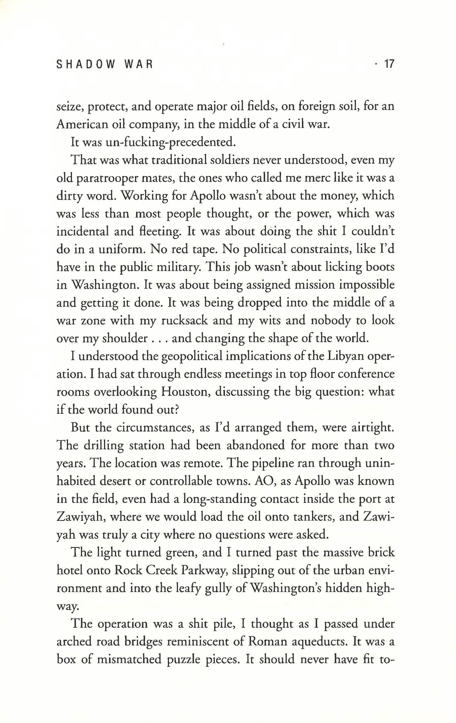 An army veteran with deep expertise in military and international affairs makes his fiction debut with this electrifying international thrillerthe first volume in a blistering hot series in the tradition of Brad Thor, Tom Clancy, and Daniel Silva. In Shadow War, an elite American mercenary on a secret mission to save a businessmans family in Eastern Europe must navigate perilous setbacks and deadly enemies that threaten to tip the balance of power between Russia and the United States. Tom Locke is an elite warrior working for Apollo Outcomes, one of the worlds most successful private contracting firms. Pulled out of a mission in Libya, he is tapped for an unusual and risky assignment: a top secret black op in Ukraine. He is given one week to rescue an oligarchs family and pull off a spectacular assault that could have long-lasting repercussions for this imperiled Eastern European nation and the world. What Locke doesnt know is that the operation comes with a dangerous complication: Brad Winters. Lockes ambitious and enigmatic boss is engaged in a secretive, high-stakes geopolitical chess game with several influential powerbrokers in capitals around the world. One misstep could cost himand Lockeeverything. While Locke has methodically planned the mission and hand-picked a team of trusted operatives to pull it offand save his ass if things go southhe doesnt count on running into a former love, war correspondent Alie MacFarlane, who impulsively makes a move that risks both their lives. Locke is an intelligent, iconoclastic soldier who specializes in pulling off the impossible. But all his brilliant preparation cant prevent the kind of backstabbing and deception that could lead to catastrophe . . . and tip the balance of power toward Putins Russia.