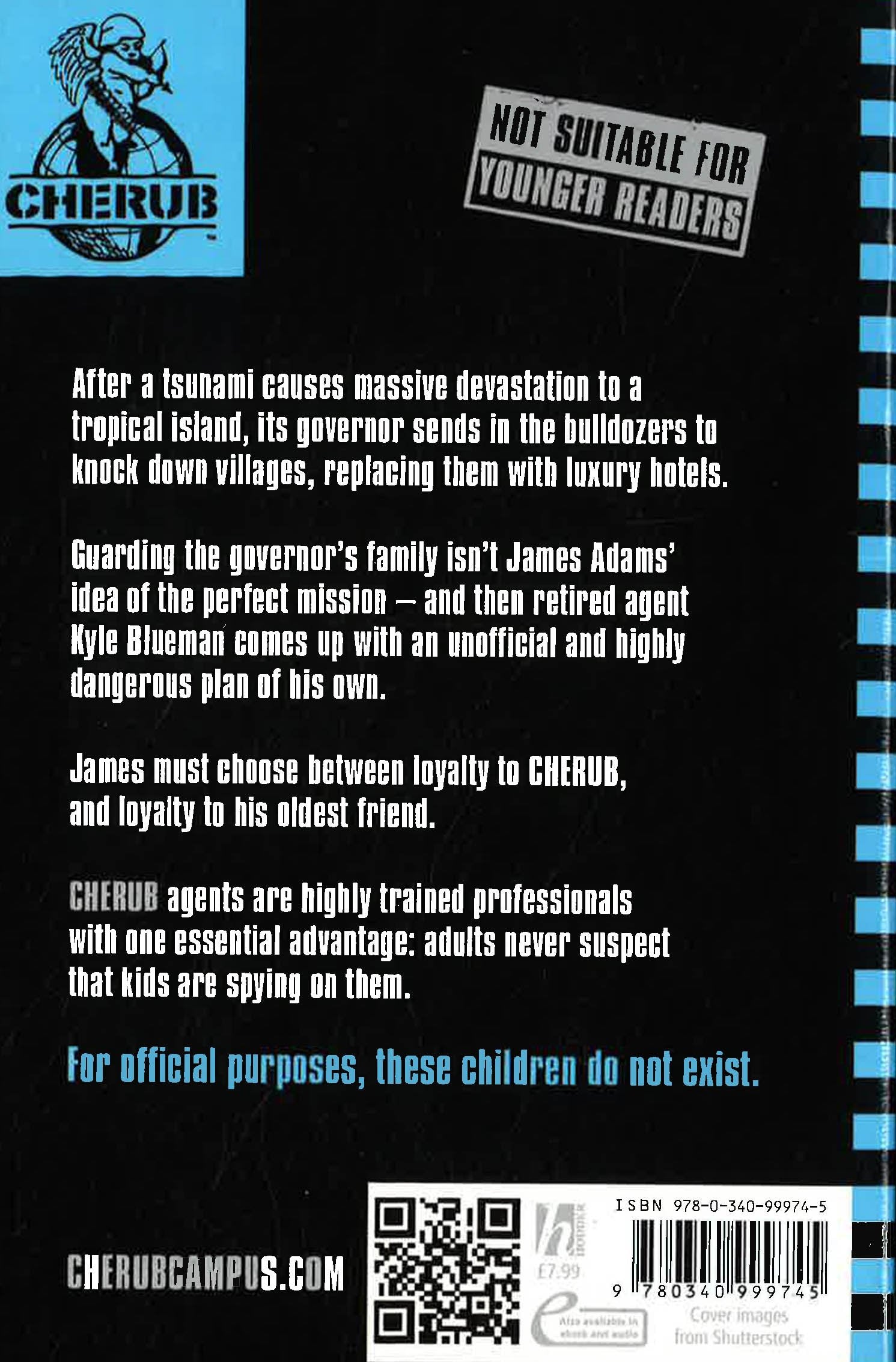 The twelfth title in the number one bestselling CHERUB series! James Adams' loyalties are tested in his most dangerous mission yet ...After a tsunami causes massive devastation to a tropical island, its governor sends in the bulldozers to knock down villages, replacing them with luxury hotels.Guarding the corrupt governor's family isn't James Adams' idea of the perfect mission, especially as it's going to be his last as a CHERUB agent. And then retired colleague Kyle Blueman comes up with an unofficial and highly dangerous plan of his own.James must choose between loyalty to CHERUB, and loyalty to his oldest friend.For official purposes, these children do not exist.