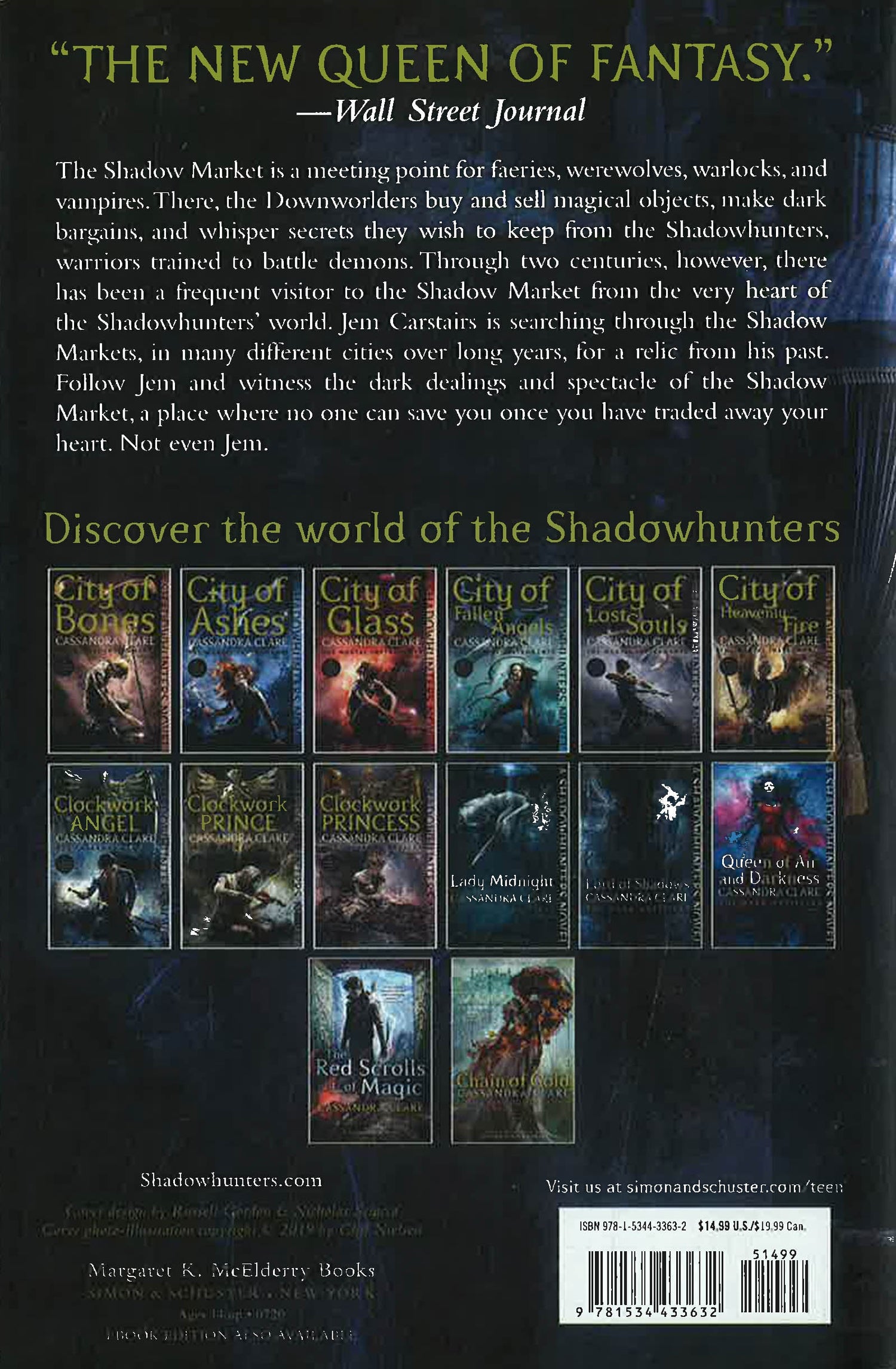 Follow Jem and see—against the backdrop of the Shadow Market’s dark dealings and spectacle—Anna Lightwood’s doomed romance, Matthew Fairchild’s great sin, and Tessa Gray as she is plunged into a world war. Valentine Morgenstern buys a soul at the Market and a young Jace Wayland’s soul finds safe harbor. In the Market is hidden a lost heir and a beloved ghost, and no one can save you once you have traded away your heart. Not even Jem.