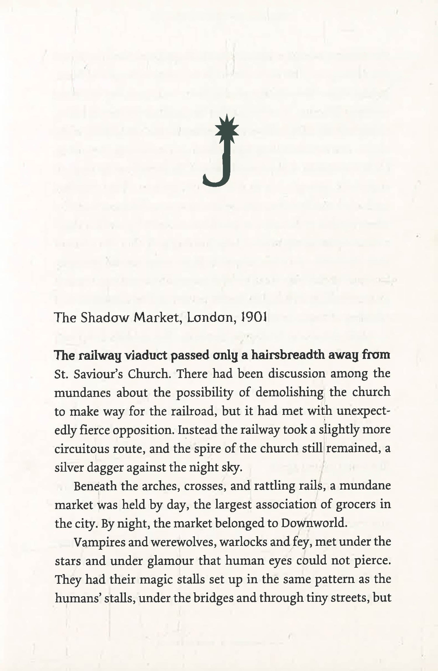 The Shadow Market is a meeting point for faeries, werewolves, warlocks, and vampires. There, the Downworlders buy and sell magical objects, make dark bargains, and whisper secrets they do not want the Shadowhunters to know. Through two centuries, however, there has been a frequent visitor to the Shadow Market from the very heart of the Shadowhunters’ world. Jem Carstairs is searching through the Shadow Market, in many different cities over long years, for a relic from his past.