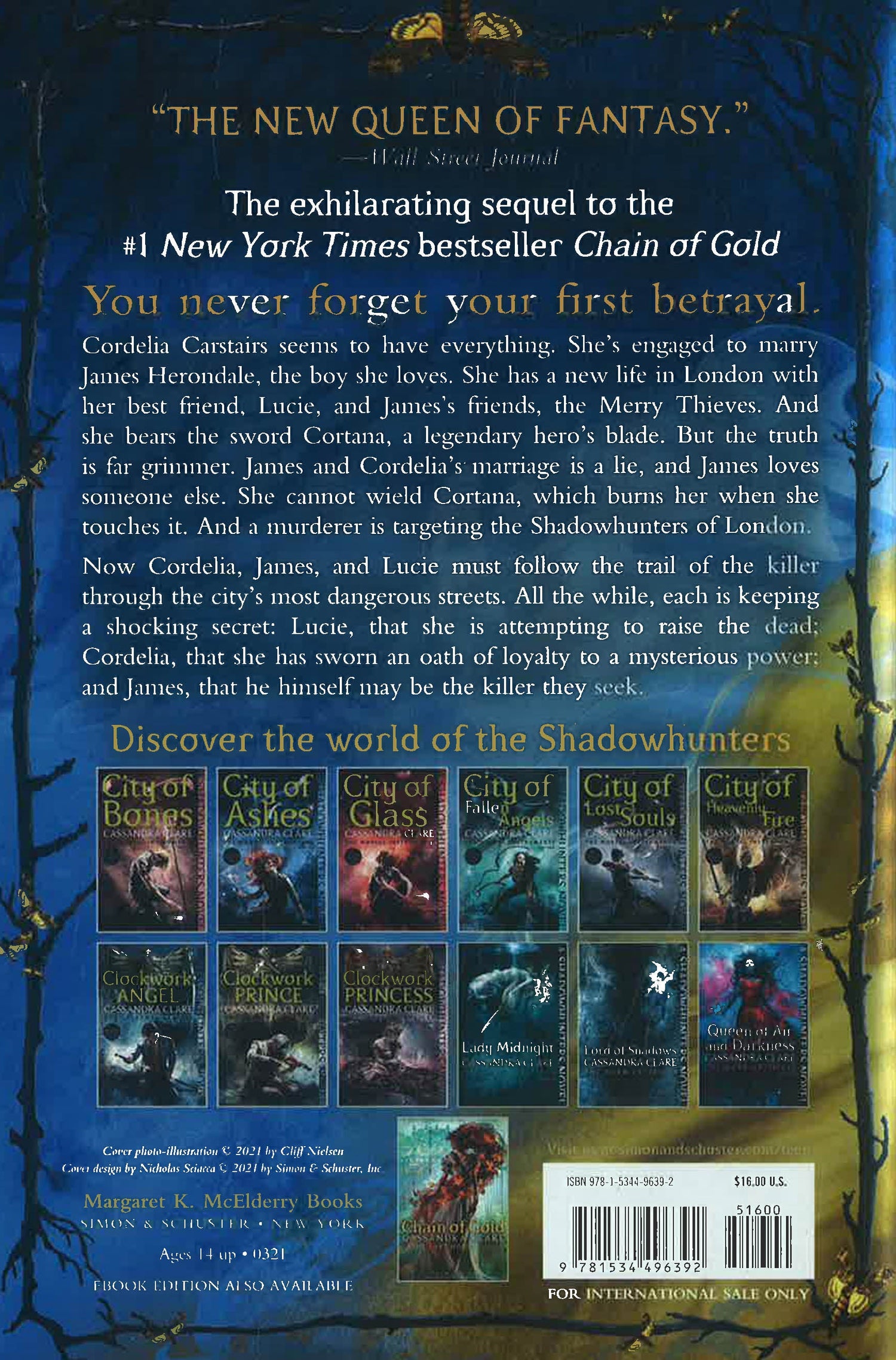 But the truth is far grimmer. James and Cordelia’s marriage is a lie, arranged to save Cordelia’s reputation. James is in love with the mysterious Grace Blackthorn whose brother, Jesse, died years ago in a terrible accident. Cortana burns Cordelia’s hand when she touches it, while her father has grown bitter and angry. And a serial murderer is targeting the Shadowhunters of London, killing under cover of darkness, then vanishing without a trace.
