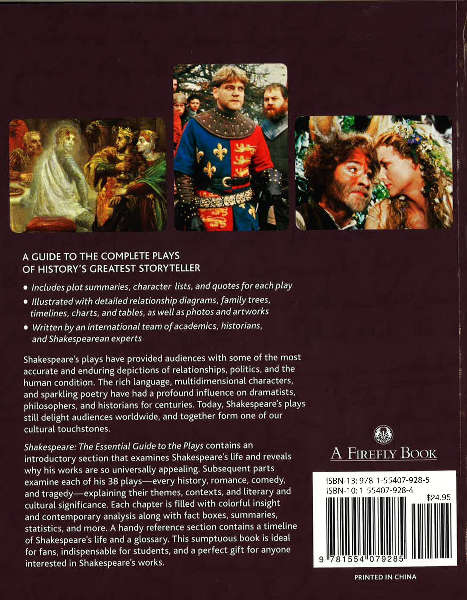Four centuries after he penned them, Shakespeare's plays continue to delight audiences and readers worldwide. Shakespeare: The Essential Guide to the Plays is a stimulating and accessible guide to all of Shakespeare's known works as well as a revealing study of the man himself. More than 250 full-color photographs, artworks, illustrations, charts and diagrams highlight the concise text, which was written by an international team of Shakespearean scholars. The book includes: The personal and professional life of Shakespeare. Plot summaries and character lists for each play. Coverage of every history, comedy, tragedy and romance in the Shakespeare canon, from the well known (Hamlet, Othello, A Midsummer Night's Dream) to the more obscure (King John, Pericles, Cymbeline). A comprehensive reference section. Each work's themes, imagery, language and historical context are discussed in accessible language. Sidebars give at-a-glance information on plots, characters, sources, settings and famous quotations. Detailed diagrams, charts and tables shed light on the plays' characters and their interrelationships and illustrate the factual context of the plots. Finally, carefully selected images of stage and film productions from different cultures and historical periods convey the drama, pathos and humor of Shakespeare's works and provide clear evidence of the universality and modernity of his centuries-old creations.