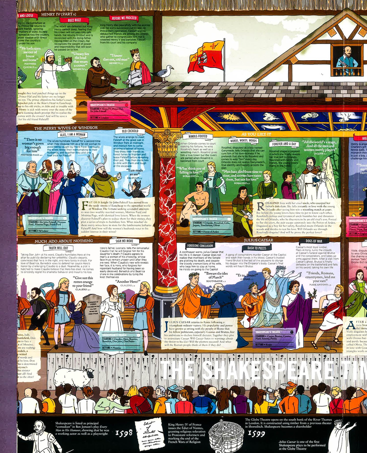WILLIAM SHAKESPEARE'S plays are presented as never before, with all thirty-eight masterpieces simultaneously performed in front of you on a 6-foot fold-out timeline set in the iconic Globe Theatre. Spot the ghosts, hunt for the murderers, discover the poison, and revel in Elizabethan romance as each play unfolds. Concise plot summaries, key textual quotes, and carefully illustrated scenes help pinpoint the action. Developed in partnership with the Shakespeare Birthplace Trust, the timeline also features essential moments in Shakespeare's life providing a unique narrative context to the works of the world's favourite bard.