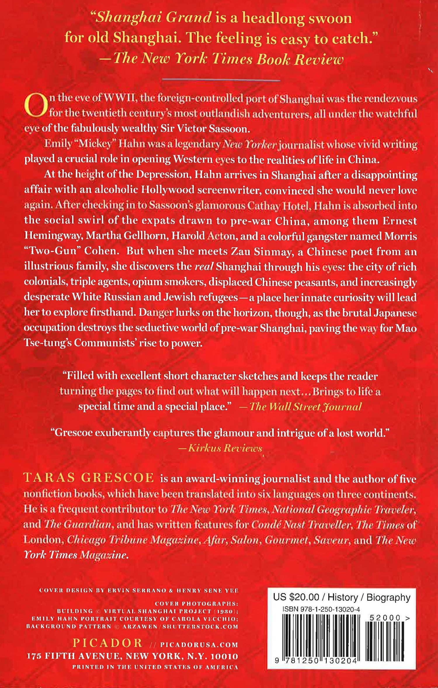 Taras Grescoe spins the true story of a British aristocrat, an American flapper, and a Chinese poet who found themselves trapped in an unlikely love triangle amid the decadence of Jazz Age Shanghai.On the eve of WWII, the foreign-controlled port of Shanghai was the rendezvous for the twentieth century’s most outlandish adventurers, all under the watchful eye of the fabulously wealthy Sir Victor Sassoon.Emily “Mickey” Hahn was a legendary New Yorker journalist whose vivid writing played a crucial role in opening Western eyes to the realities of life in China.At the height of the Depression, Hahn arrives in Shanghai after a disappointing affair with an alcoholic Hollywood screenwriter, convinced she would never love again. After checking in to Sassoon’s glamorous Cathay Hotel, Hahn is absorbed into the social swirl of the expats drawn to pre-war China, among them Ernest Hemingway, Martha Gellhorn, Harold Acton, and a colorful gangster named Morris “Two-Gun” Cohen. But when she meets Zau Sinmay, a Chinese poet from an illustrious family, she discovers the real Shanghai through his eyes: the city of rich colonials, triple agents, opium smokers, displaced Chinese peasants, and increasingly desperate White Russian and Jewish refugees - a place her innate curiosity will lead her to explore firsthand. Danger lurks on the horizon, though, as the brutal Japanese occupation destroys the seductive world of pre-war Shanghai, paving the way for Mao Tse-tung’s Communists rise to power.