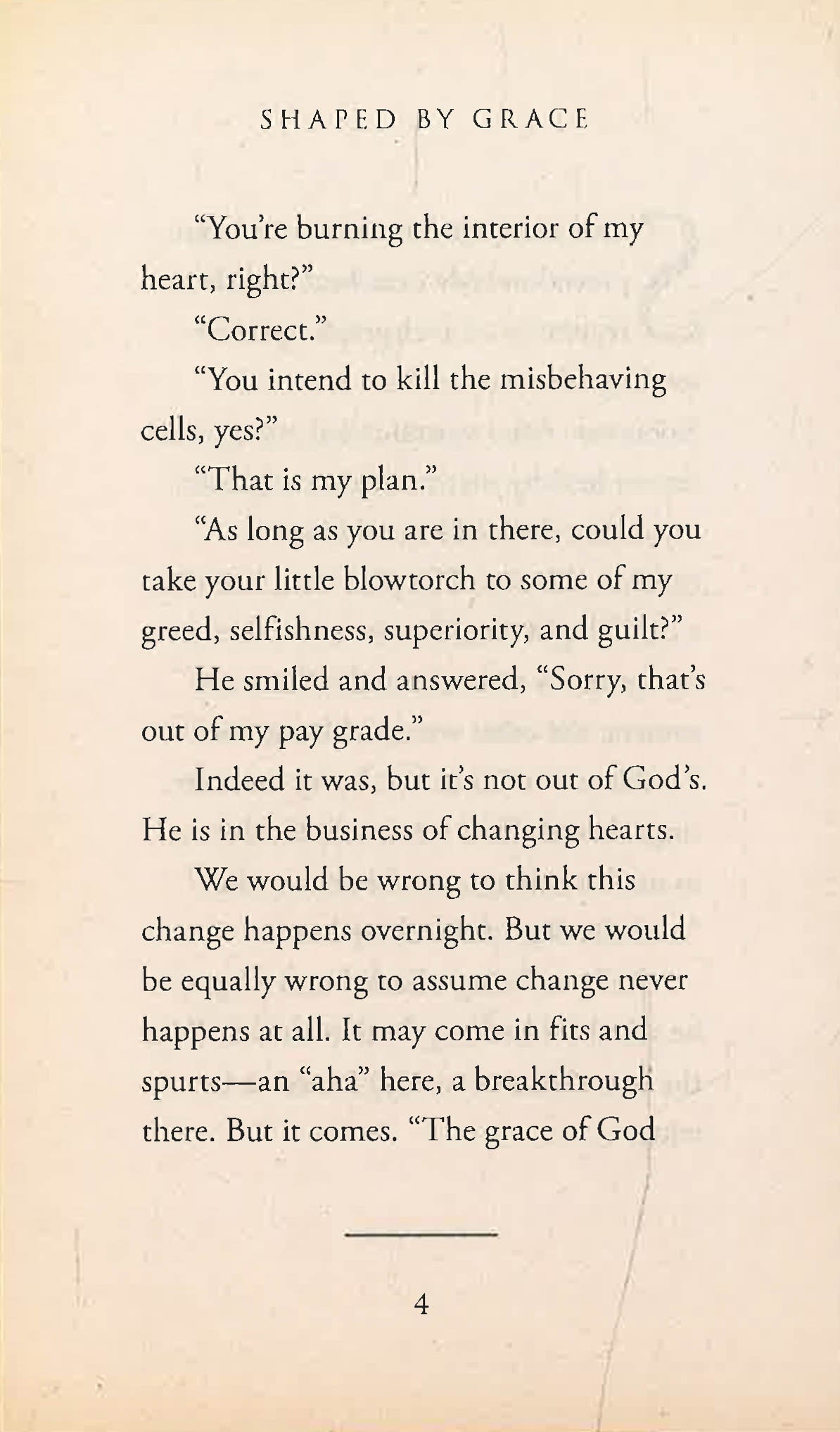 A perfect pass-along companion to "GRACE," "Shaped by Grace"introduces readers to a message that is more than we deserve, greater than weimagine. Including a clear presentation of the Gospel message, this bookletoffers the perfect starting point on a lifetime of grace discovery.