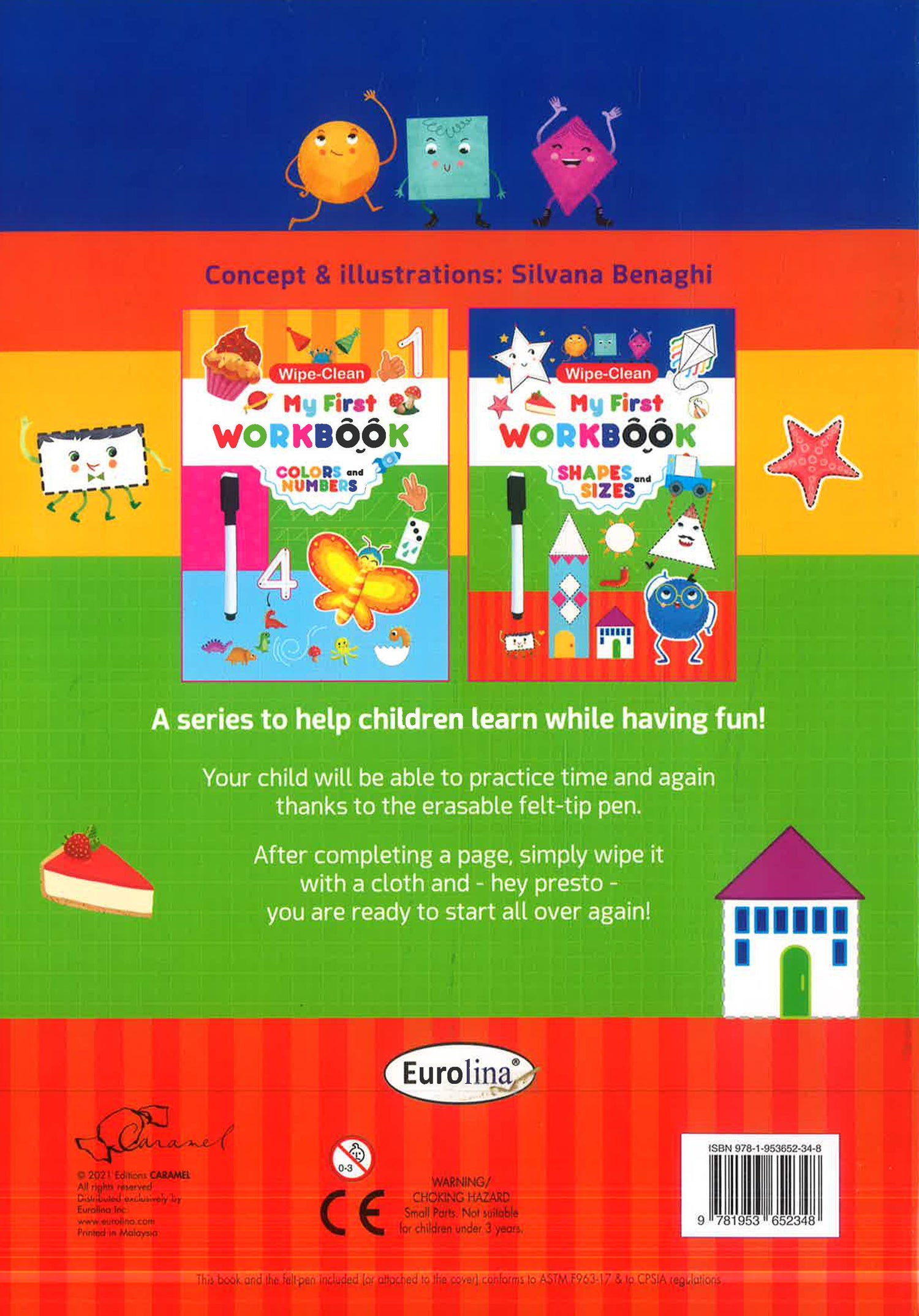 Make learning shapes and sizes fun with this colorful Wipe-Clean activity workbook. Use the felt-tip pen to play the games and puzzles and then....wipe the pages with a cloth and start over.