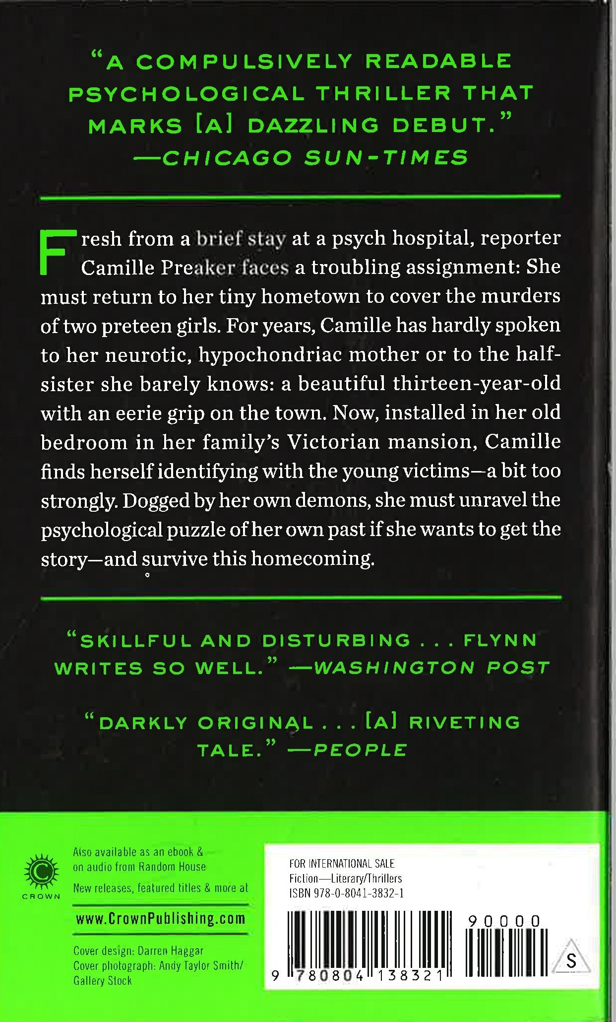 Fresh from a brief stay at a psych hospital, reporter Camille Preaker faces a troubling assignment: she must return to her tiny hometown to cover the murders of two preteen girls. For years, Camille has hardly spoken to her neurotic, hypochondriac mother or to the half-sister she barely knows: a beautiful thirteen-year-old with an eerie grip on the town. Now, installed in her old bedroom in her family's Victorian mansion, Camille finds herself identifying with the young victims—a bit too strongly. Dogged by her own demons, she must unravel the psychological puzzle of her own past if she wants to get the story—and survive this homecoming.
