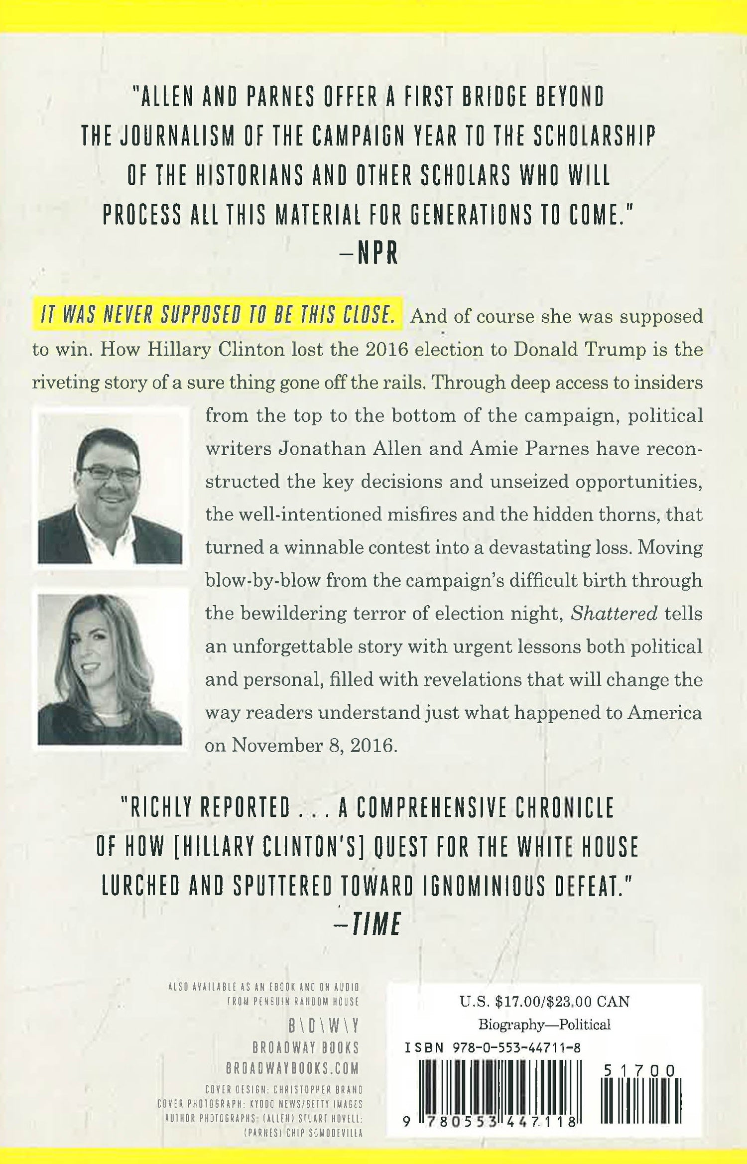 Through deep access to insiders from the top to the bottom of the campaign, political writers Jonathan Allen and Amie Parnes have reconstructed the key decisions and unseized opportunities, the well-intentioned misfires and the hidden thorns that turned a winnable contest into a devastating loss. Drawing on the authors' deep knowledge of Hillary from their previous book, the acclaimed biography HRC, Shattered will offer an object lesson in how Hillary herself made victory an uphill battle, how her difficulty articulating a vision irreparably hobbled her impact with voters, and how the campaign failed to internalize the lessons of populist fury from the hard-fought primary against Bernie Sanders.