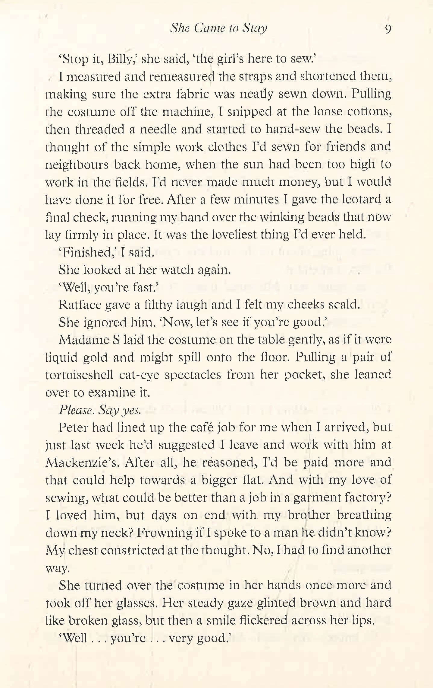 Her passion for clothes and flair for sewing land her a job repairing the glittering costumes at the notorious Pelican Revue. It's here that she befriends the mysterious and beautiful Bebba.