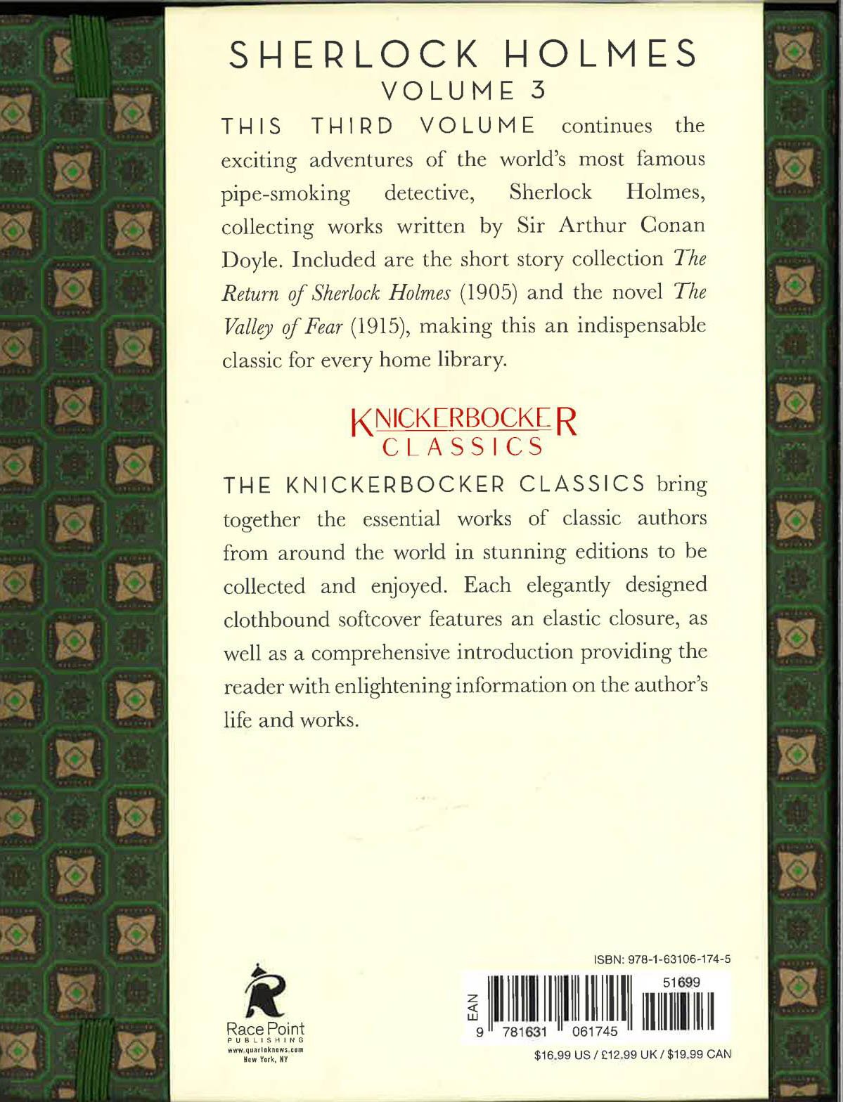 This great series addition of Sherlock Holmes includes a full-length novels and short stories. Sherlock Holmes: Volume 3 continues the exciting adventures of the world's most famous pipe-smoking detective, Sherlock Holmes, collecting works written by Sir Arthur Conan Doyle. Included are the short story collection The Return of Sherlock Holmes (1905) and the novel The Valley of Fear (1915). From his home, 221B Baker Street in London, the legendary Sherlock Holmes (accompanied by his loyal companion and chronicler, Dr. Watson) employs his mastery of deductive reasoning and expert sleuthing to solve an arraying of complex and harrowing cases, baffling the police and becoming internationally renowned for his remarkable observations and even more eccentric habits. Complete and unabridged, this elegantly designed clothbound edition features an elastic closure and a new introduction by Daniel Stashower.