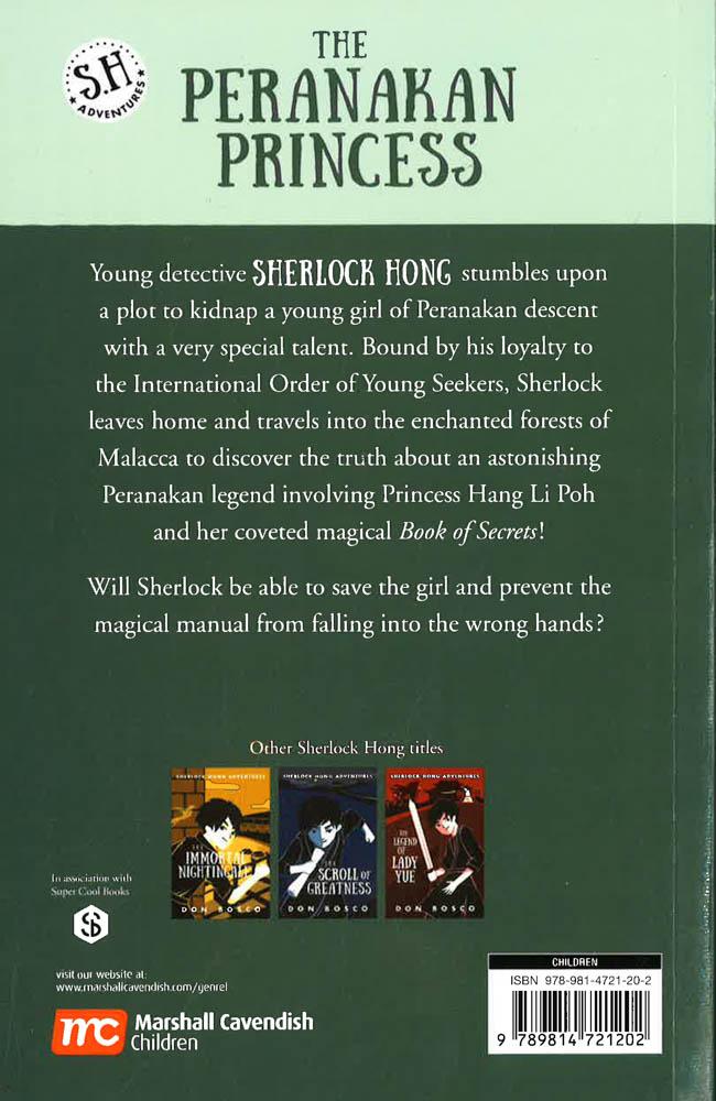 In the secondtitle of the Sherlock Hong series, young detective Sherlock Hong stumbles upona plot to kidnap a young girl of Peranakan descent with a very special talent.Bound by his loyalty to the International Order of Young Seekers, Sherlockleaves home and travels into the enchanted forests of Malacca to discover thetruth about an astonishing Peranakan legend involving Princess Hang Li Poh andher coveted magical Book of Secrets! Will Sherlockbe able to save the descendent of Princess Hang Li Poh and prevent the magical manualfrom falling into the wrong hands?