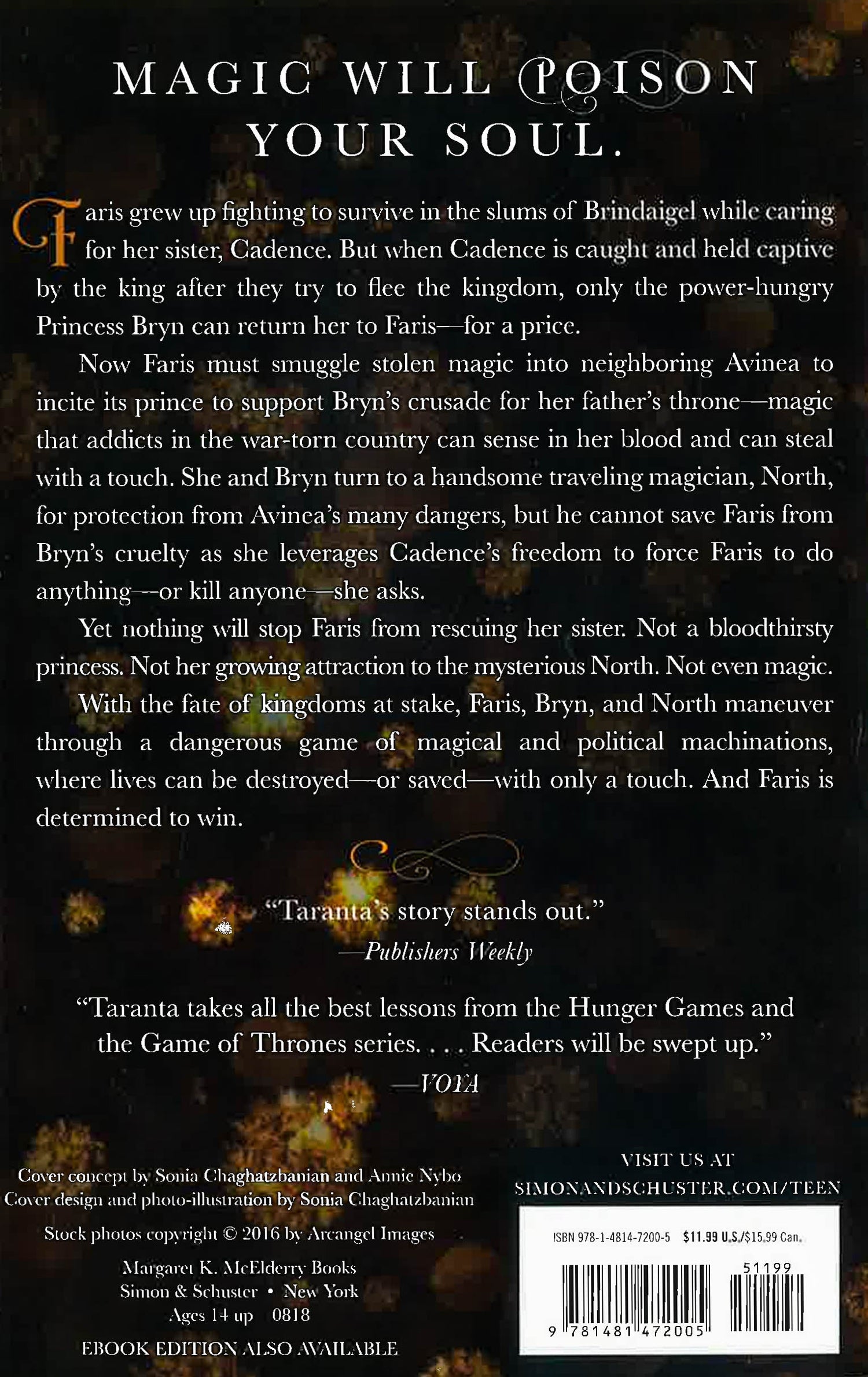 To save her sister's life, Faris must smuggle magic into a plague-ridden neighboring kingdom in this exciting and dangerous start to a brand-new fantasy duology. Faris grew up fighting to survive in the slums of Brindaigel while caring for her sister, Cadence. But when Cadence is caught trying to flee the kingdom and is sold into slavery, Faris reluctantly agrees to a lucrative scheme to buy her back, inadvertently binding herself to the power-hungry Princess Bryn, who wants to steal her father's throne. Now Faris must smuggle stolen magic into neighboring Avinea to incite its prince to alliance--magic that addicts in the war-torn country can sense in her blood and can steal with a touch. She and Bryn turn to a handsome traveling magician, North, who offers protection from Avinea's many dangers, but he cannot save Faris from Bryn's cruelty as she leverages Cadence's freedom to force Faris to do anything--or kill anyone--she asks. Yet Faris is as fierce as Bryn, and even as she finds herself falling for North, she develops schemes of her own. With the fate of kingdoms at stake, Faris, Bryn, and North maneuver through a dangerous game of magical and political machinations, where lives can be destroyed--or saved--with only a touch.