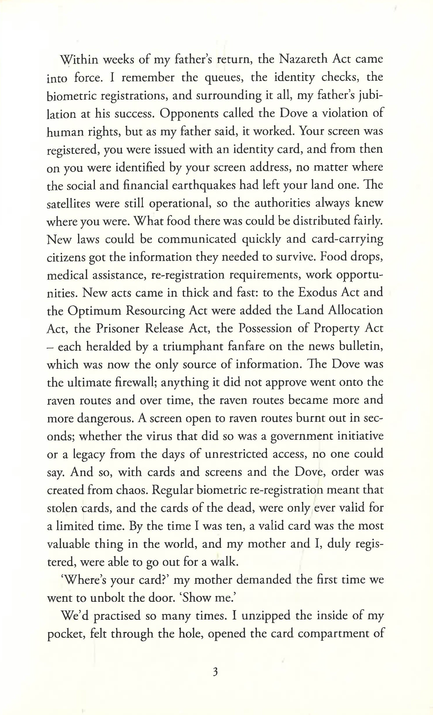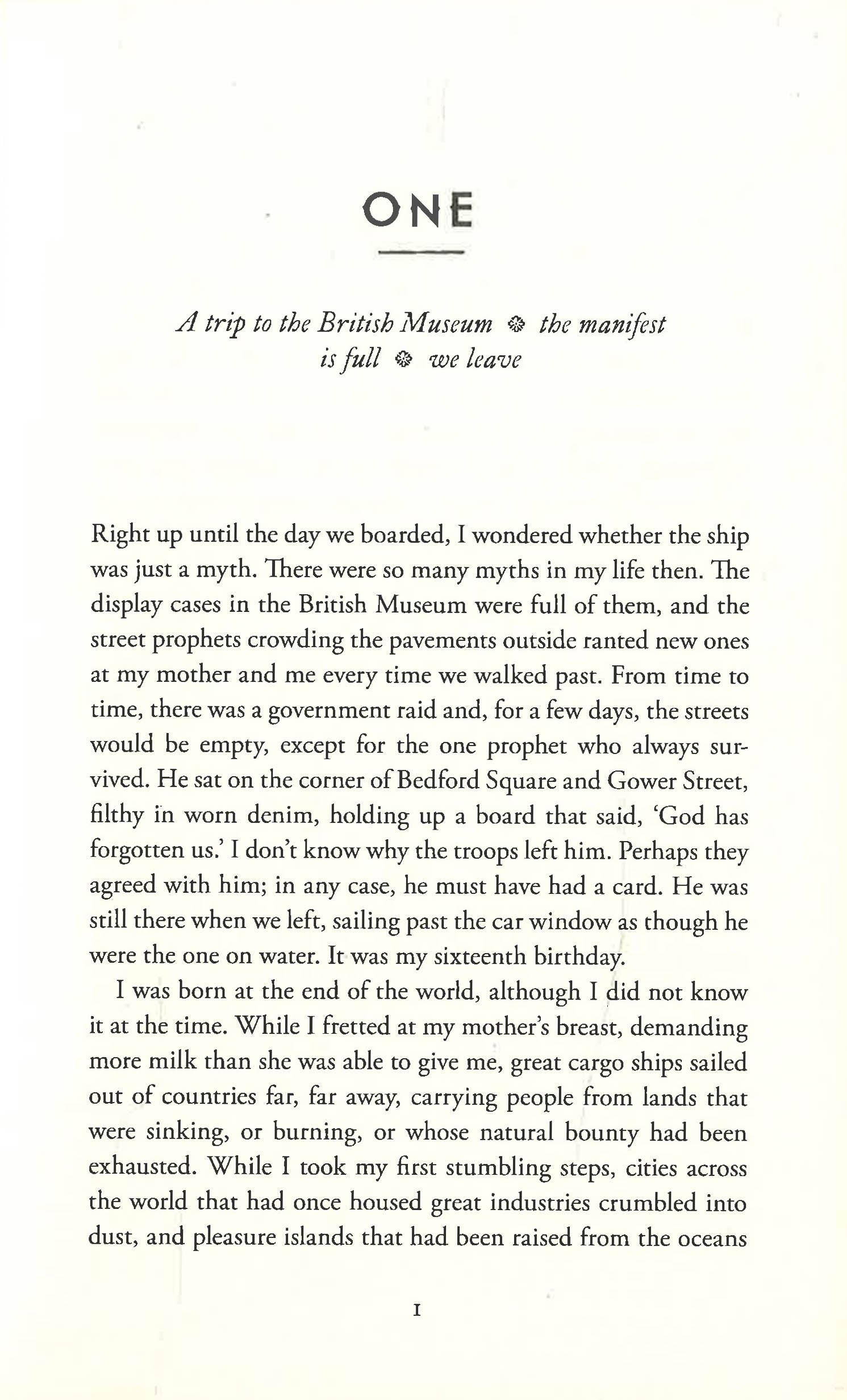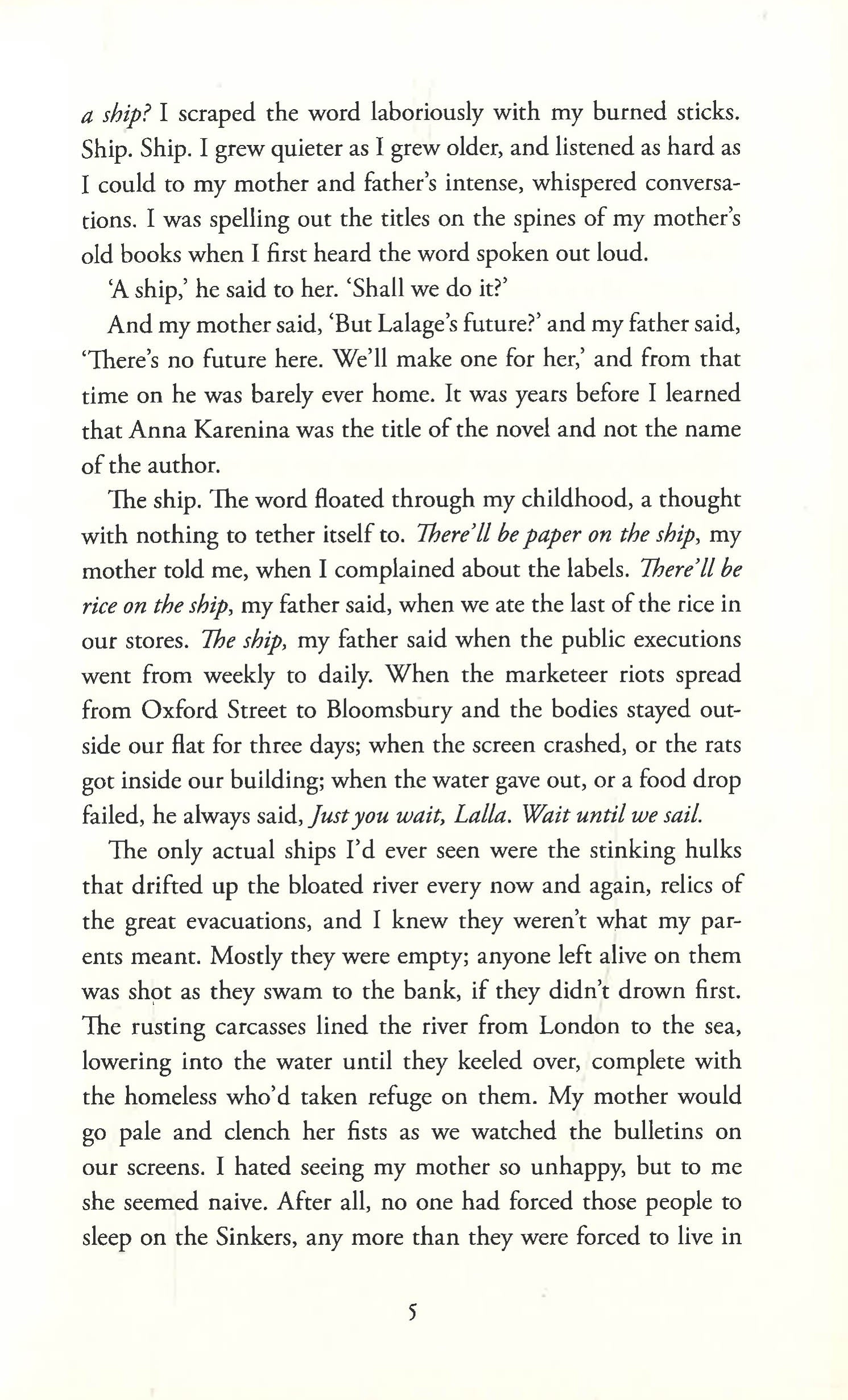 WELCOME TO LONDONBUT NOT AS YOU KNOW ITOxford Street burned for three weeks. The British Museum is occupied by ragtag survivors. The Regent's Park camps have been bombed. The Nazareth Act has come into force. If you can't produce your identity card, you don't exist.Lalla, sixteen, has grown up sheltered from the new reality by her visionary father, Michael Paul. But now the chaos has reached their doorstep. Michael has promised to save them. His escape route is a ship big enough to save five hundred people. But only the worthy will be chosen. Once on board, as day follows identical day, Lalla's unease grows. Where are they going? What does her father really want?WHAT IS THE PRICE OF SALVATION?