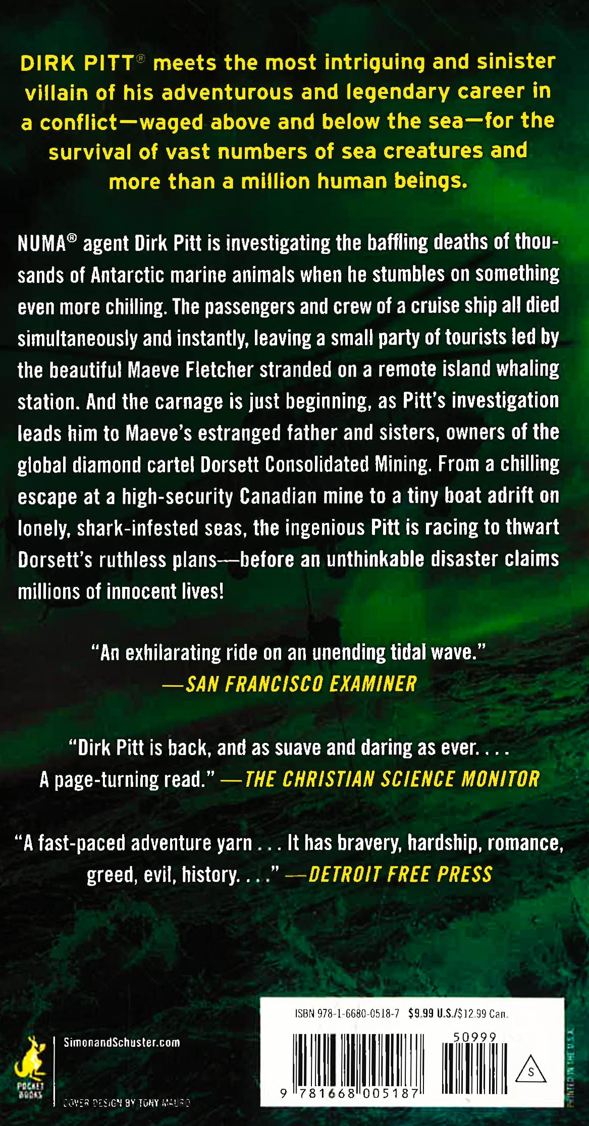 NUMA Special Projects Director Dirk Pitt is investigating the baffling deaths of thousands of Antarctic marine animals when he stumbles on something even more chilling. The passengers and crew of a cruise ship all died simultaneously and instantly, leaving a small party of tourists led by the beautiful Maeve Fletcher stranded on a remote island whaling station. And the carnage is just beginning, as Pitt’s investigation leads him to Maeve’s estranged father and sisters, owners of the global diamond cartel Dorsett Consolidated Mining. From a chilling escape at a high-security Canadian mine to a tiny boat adrift on lonely, shark-infested seas, the ingenious Pitt is racing to thwart Dorsett's ruthless plans—before an unthinkable disaster claims millions of innocent lives!