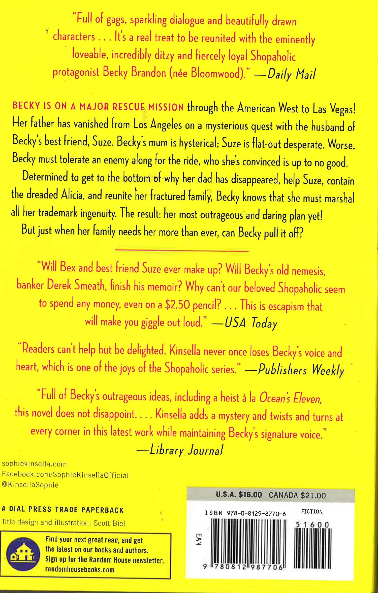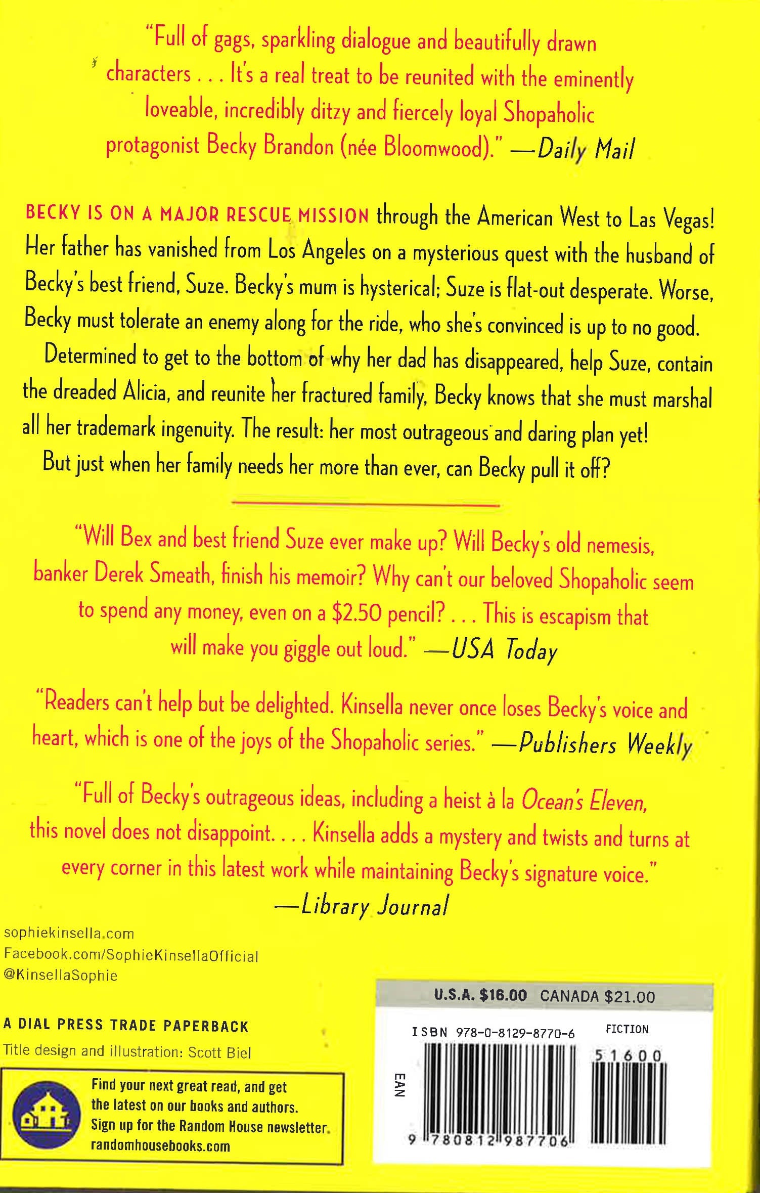 #1 New York Times bestselling author Sophie Kinsella returns with another laugh-out-loud Becky Brandon (née Bloomwood) adventure: a hilarious road trip through the American West to Las Vegas. Becky is on a major rescue mission through the American West to Las Vegas! Her father has vanished from Los Angeles on a mysterious quest with the husband of Becky's best friend, Suze. Becky's mum is hysterical; Suze is flat-out desperate. Worse, Becky must tolerate an enemy along for the ride, who she's convinced is up to no good. Determined to get to the bottom of why her dad has disappeared, help Suze, contain the dreaded Alicia, and reunite her fractured family, Becky knows that she must marshal all her trademark ingenuity. The result: her most outrageous and daring plan yet! But just when her family needs her more than ever, can Becky pull it off? Praise for Shopaholic to the Rescue