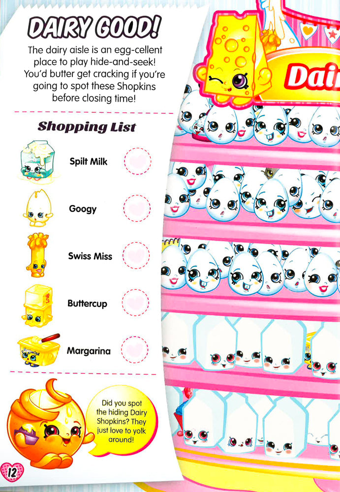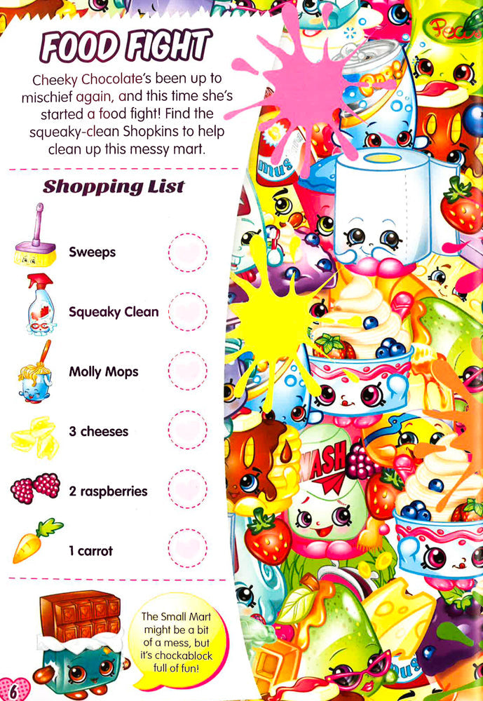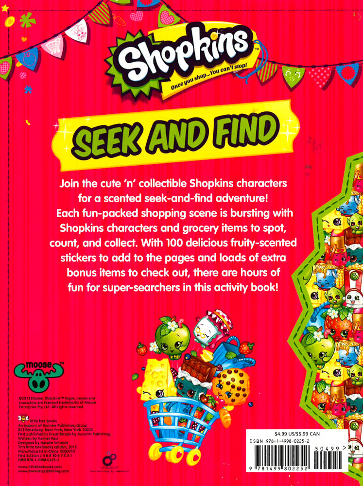 Join the cute 'n' collectible Shopkins characters for a scented seek-and-find adventure! Each fun-packed shopping scene is bursting with Shopkins characters and grocery items to spot, count, and collect. With 100 delicious fruity-scented stickers to add to the pages and loads of extra bonus items to check out, there are hours of fun for super-searchers in this activity book!