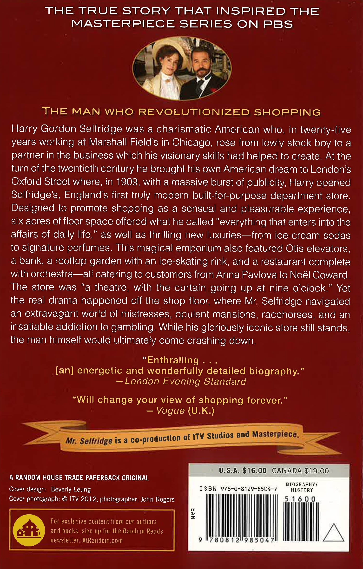 If you lived at Downton Abbey, you shopped at Selfridge?s. Harry Gordon Selfridge was a charismatic American who, in twenty-five years working at Marshall Field?s in Chicago, rose from lowly stockboy to a partner in the business which his visionary skills had helped to create. At the turn of the twentieth century he brought his own American dream to London?s Oxford Street where, in 1909, with a massive burst of publicity, Harry opened Selfridge?s, England?s first truly modern built-for-purpose department store. Designed to promote shopping as a sensual and pleasurable experience, six acres of floor space offered what he called ?everything that enters into the affairs of daily life,? as well as thrilling new luxuries?from ice-cream soda to signature perfumes. This magical emporium also featured Otis elevators, a bank, a rooftop garden with an ice-skating rink, and a restaurant complete with orchestra?all catering to customers from Anna Pavlova to Noel Coward. The store was ?a theatre, with the curtain going up at nine o?clock.? Yet the real drama happened off the shop floor, where Mr. Selfridge navigated an extravagant world of mistresses, opulent mansions, racehorses, and an insatiable addiction to gambling. While his gloriously iconic store still stands, the man himself would ultimately come crashing down. *This book may have remainder mark*
