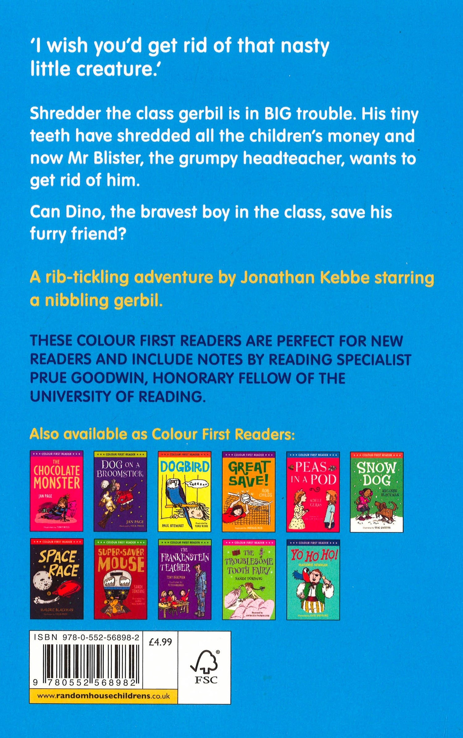 I wish you'd get rid of that nasty little creature!' Shredder the class gerbil is in big trouble. His tiny teeth have shredded all the children's money and now Mr Blister, the grumpy head teacher, wants to get rid of him. Can Dino, the bravest boy in the class, save his furry friend? Colour First Readers are perfect for new readers and include notes be reading specialist Prue Goodwin, honorary fellow of the University of Reading.