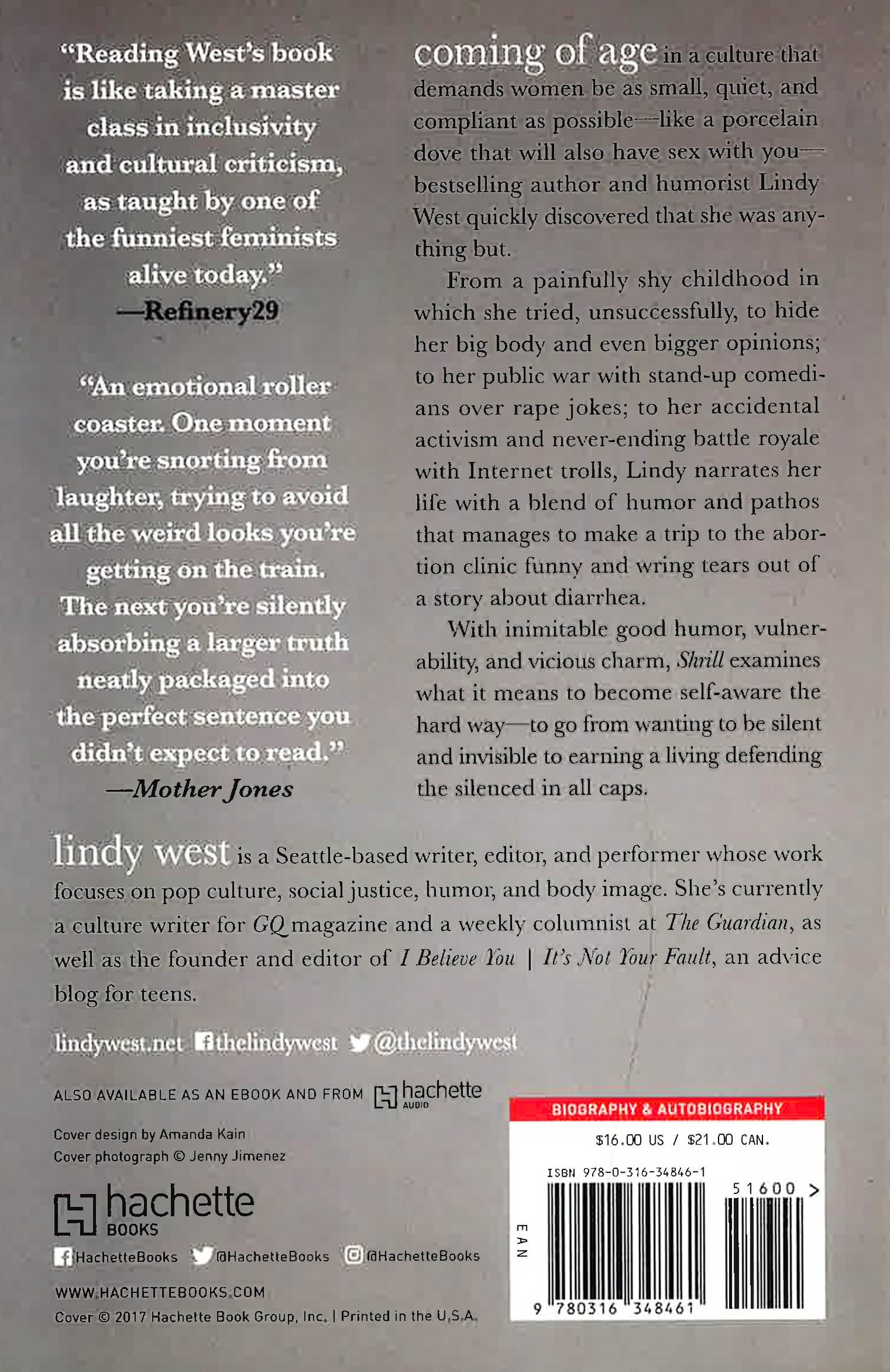 NEW YORK TIMES BESTSELLER NAMED A BEST BOOK OF THE YEAR BY: NPR, ESQUIRE, The LA Times, and NEWSWEEK WINNER OF THE STRANGER GENIUS AWARD Shrill is an uproarious memoir, a feminist rallying cry in a world that thinks gender politics are tedious and that women, especially feminists, can't be funny. Coming of age in a culture that demands women be as small, quiet, and compliant as possible--like a porcelain dove that will also have sex with you--writer and humorist Lindy West quickly discovered that she was anything but. From a painfully shy childhood in which she tried, unsuccessfully, to hide her big body and even bigger opinions; to her public war with stand-up comedians over rape jokes; to her struggle to convince herself, and then the world, that fat people have value; to her accidental activism and never-ending battle royale with Internet trolls, Lindy narrates her life with a blend of humor and pathos that manages to make a trip to the abortion clinic funny and wring tears out of a story about diarrhea. With inimitable good humor, vulnerability, and boundless charm, Lindy boldly shares how to survive in a world where not all stories are created equal and not all bodies are treated with equal respect, and how to weather hatred, loneliness, harassment, and loss, and walk away laughing. Shrill provocatively dissects what it means to become self-aware the hard way, to go from wanting to be silent and invisible to earning a living defending the silenced in all caps.