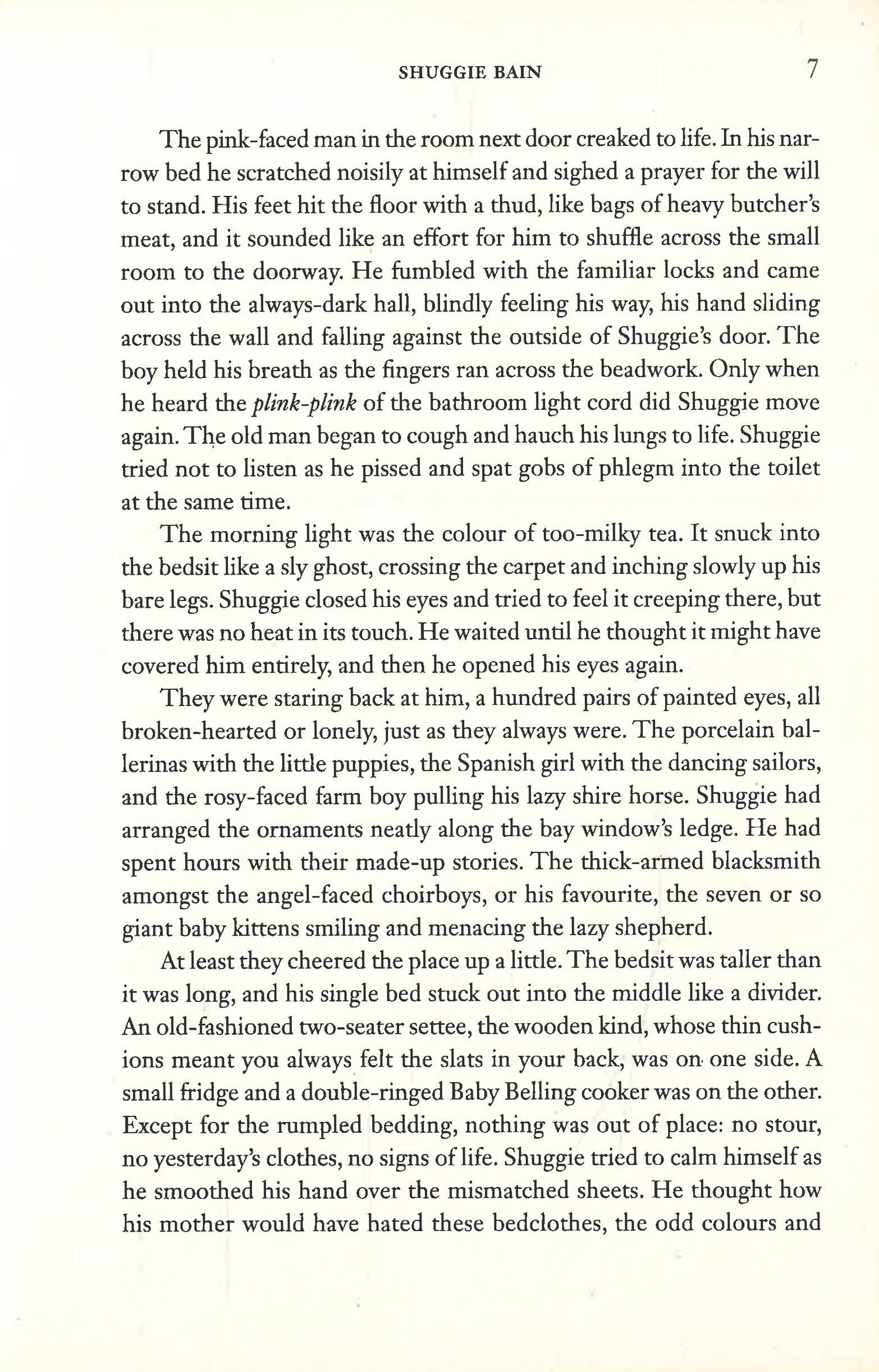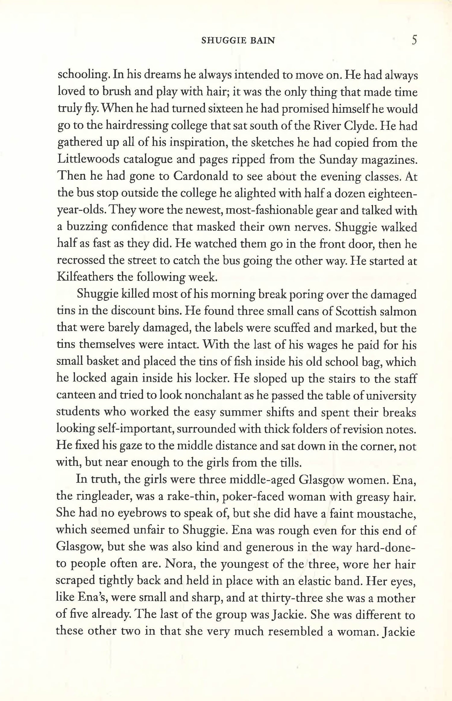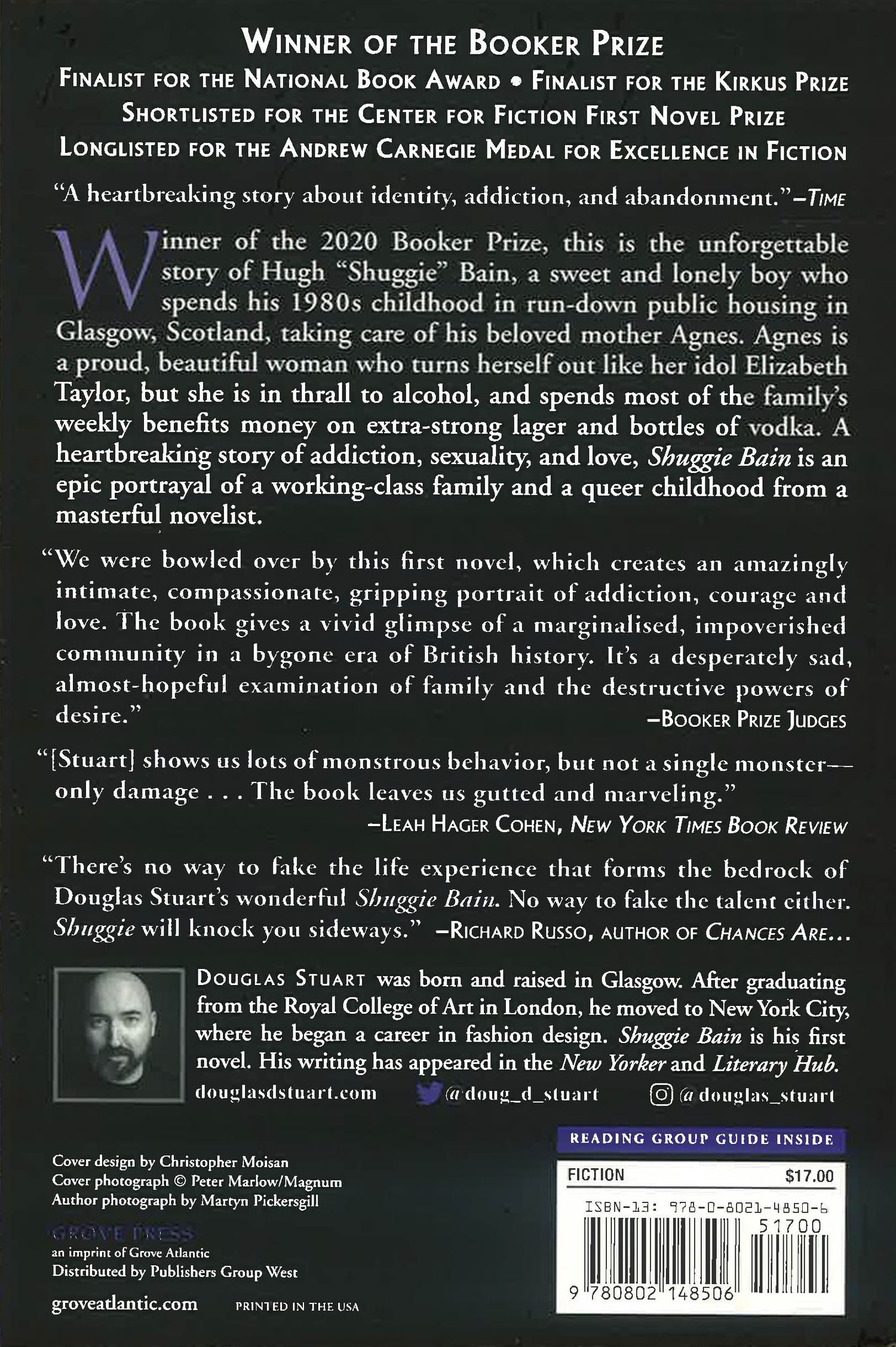 Shuggie's mother Agnes walks a wayward path: she is Shuggie's guiding light but a burden for him and his siblings. She dreams of a house with its own front door while she flicks through the pages of the Freemans catalogue, ordering a little happiness on credit, anything to brighten up her grey life. Married to a philandering taxi-driver husband, Agnes keeps her pride by looking good--her beehive, make-up, and pearly-white false teeth offer a glamorous image of a Glaswegian Elizabeth Taylor. But under the surface, Agnes finds increasing solace in drink, and she drains away the lion's share of each week's benefits--all the family has to live on--on cans of extra-strong lager hidden in handbags and poured into tea mugs. Agnes's older children find their own ways to get a safe distance from their mother, abandoning Shuggie to care for her as she swings between alcoholic binges and sobriety. Shuggie is meanwhile struggling to somehow become the normal boy he desperately longs to be, but everyone has realized that he is "no right," a boy with a secret that all but him can see. Agnes is supportive of her son, but her addiction has the power to eclipse everyone close to her--even her beloved Shuggie.