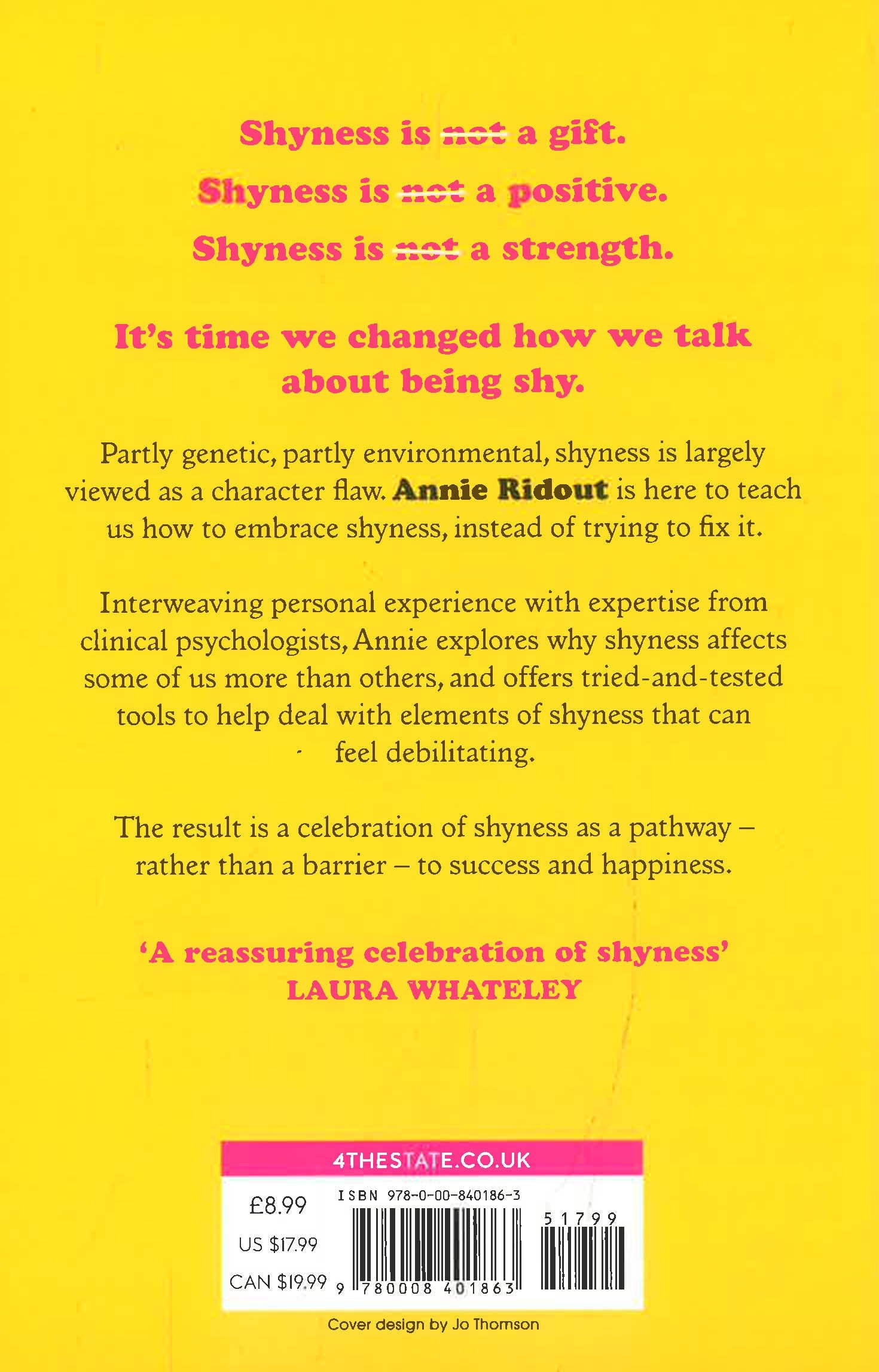 Interweaving personal experience with expertise from clinical psychologists, Annie explores why shyness affects some more than others, and offers tried-and-tested tools to help the reader deal with elements of shyness that can feel debilitating. Shy recasts our understanding of this often-misunderstood attribute, celebrating it as a pathway rather than a barrier to success and happiness.