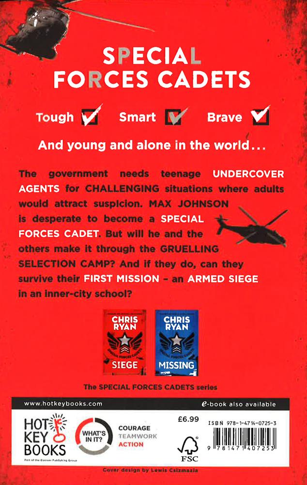 Jack will require all his skills just to stay alive as a Special Forces Cadet... A top-secret government programme needs a crack team of undercover military operators. Which is what happens when Jack Silver, Lukas Channing, Abby Asher and Sami Hakim are sent into an armed siege in an inner-city school .From the bestselling author of STRIKE BACK, Chris Ryan returns with a new action-packed series. Tough enough? Smart enough? Max will require all his skills just to stay alive as a Special Forces Cadet... A top-secret government programme needs a crack team of undercover military operators. They must have awesome levels of determination, endurance and fitness. They must be able to think on their feet. The recruits undergo the most rigorous and testing selection process the modern military can devise. And in order to operate in circumstances where adult forces would be compromised, the recruits must be under sixteen. Only a few are tough enough and smart enough to make it . . . And once out in the field, they will require all their skills just to stay alive. Which is what happens when Max Silver, Abby Asher, Lukas Channing and Sami Hakim are sent into an armed siege in an inner-city school . . .