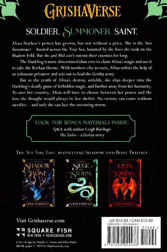 Hunted across the True Sea, haunted by the lives she took on the Fold, Alina must try to make a life with Mal in an unfamiliar land, all while keeping her identity as the Sun Summoner a secret. But she can't outrun her past or her destiny for long. The Darkling has emerged from the Shadow Fold with a terrifying new power and a dangerous plan that will test the very boundaries of the natural world. With the help of a notorious privateer, Alina returns to the country she abandoned, determined to fight the forces gathering against Ravka. But as her power grows, Alina slips deeper into the Darkling's game of forbidden magic, and farther away from Mal. Somehow, she will have to choose between her country, her power, and the love she always thought would guide her--or risk losing everything to the oncoming storm.