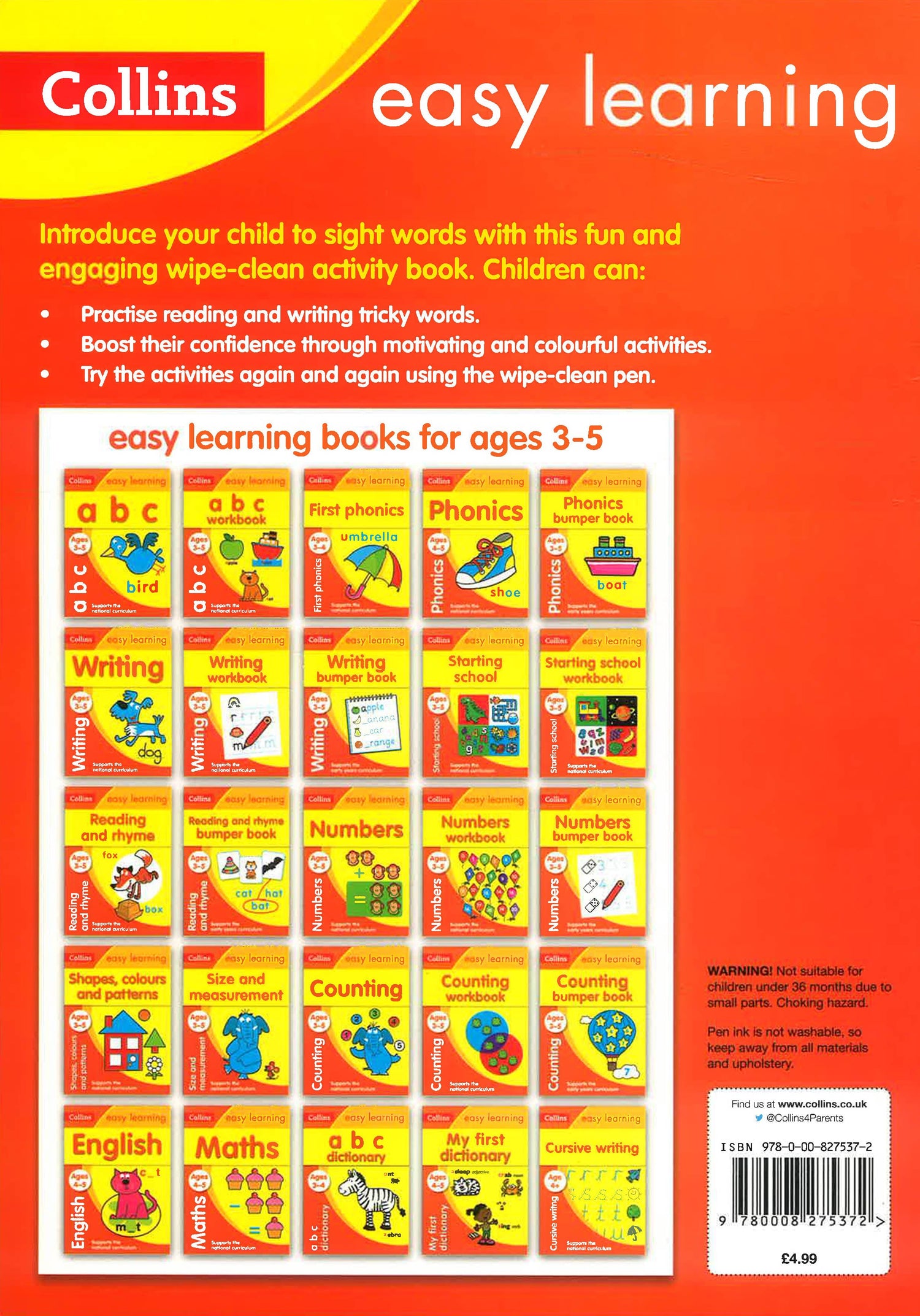 Level: EYFS Subject: English Introduce young learners to reading and writing with this fun and engaging wipe-clean activity book. Lots of practice opportunities to help children to read, write and spell the most common sight words, including 'the', 'to' and 'all'.Wipe-clean pages and pen so that children can try the activities again and again.Motivating, colourful activities to help boost confidence.
