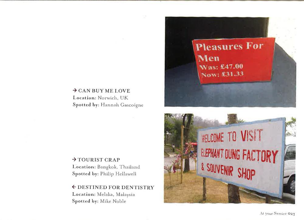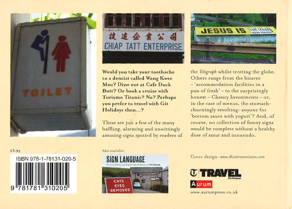 Would you take your toothache to a dentist called Wong Kwee Mau? Dine out at Cafe Buck Butt? Or book a cruise with Turismo Titanic? No? Perhaps you prefer to travel with Git Holidays then...? These are just a few of the many baffling, alarming and unwittingly amusing signs spotted by readers of the Telegraph whilst trotting the globe. Others range from the bizarre - 'accomodation facilities in a pan of fresh' - to the surprisingly honest - Chancy Investments - or, in the case of menus, the stomach-churningly revolting: anyone for 'bottom sauce with yogurt'? And, of course, no collection of funny signs would be complete without a healthy dose of smut and innuendo.