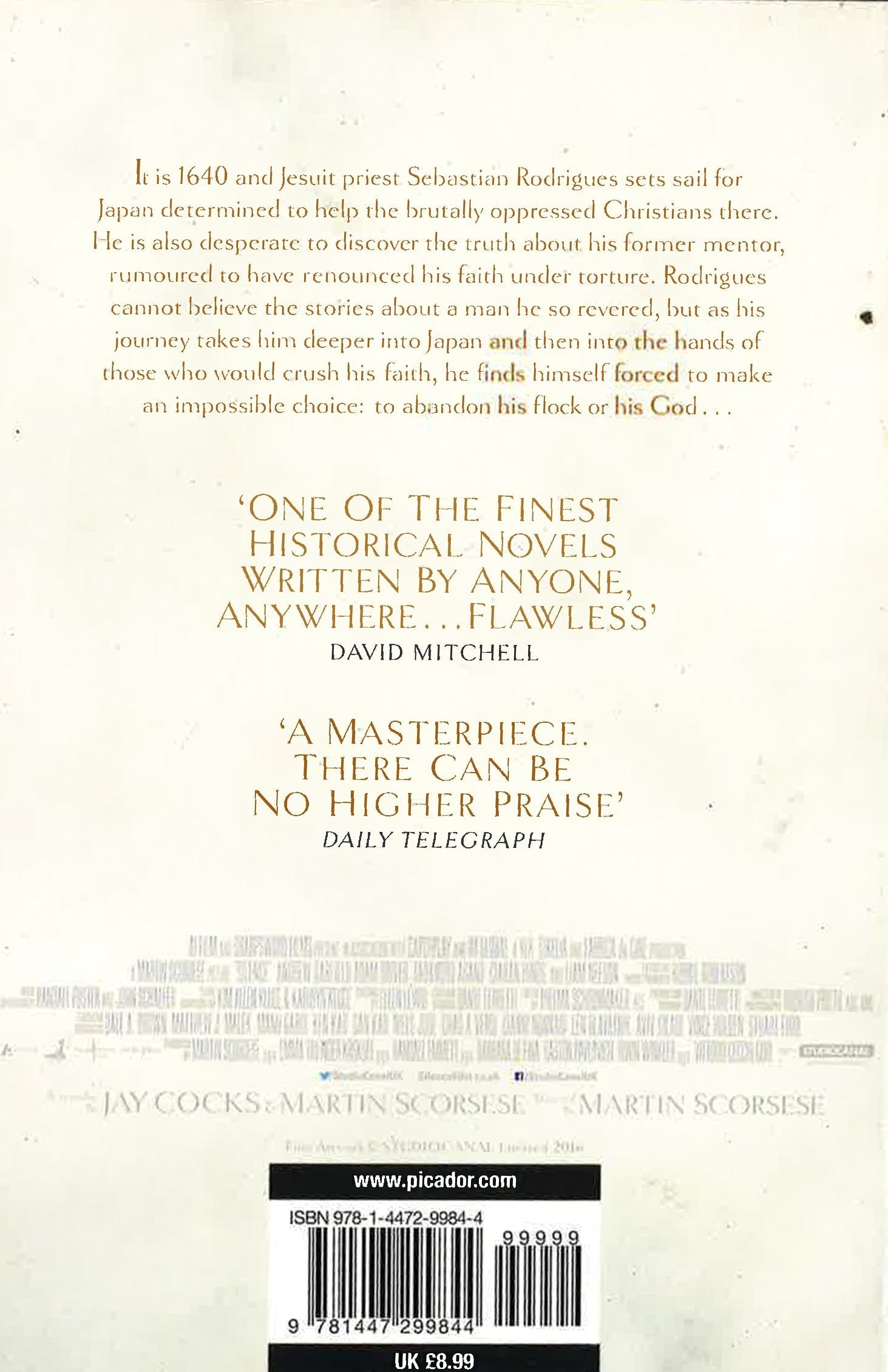 Father Rodrigues is an idealistic Portuguese Jesuit priest who, in the 1640s, sets sail for Japan on a determined mission to help the brutally oppressed Japanese Christians and to discover the truth behind unthinkable rumours that his famous teacher Ferreira has renounced his faith. Once faced with the realities of religious persecution Rodrigues himself is forced to make an impossible choice: whether to abandon his flock or his God.