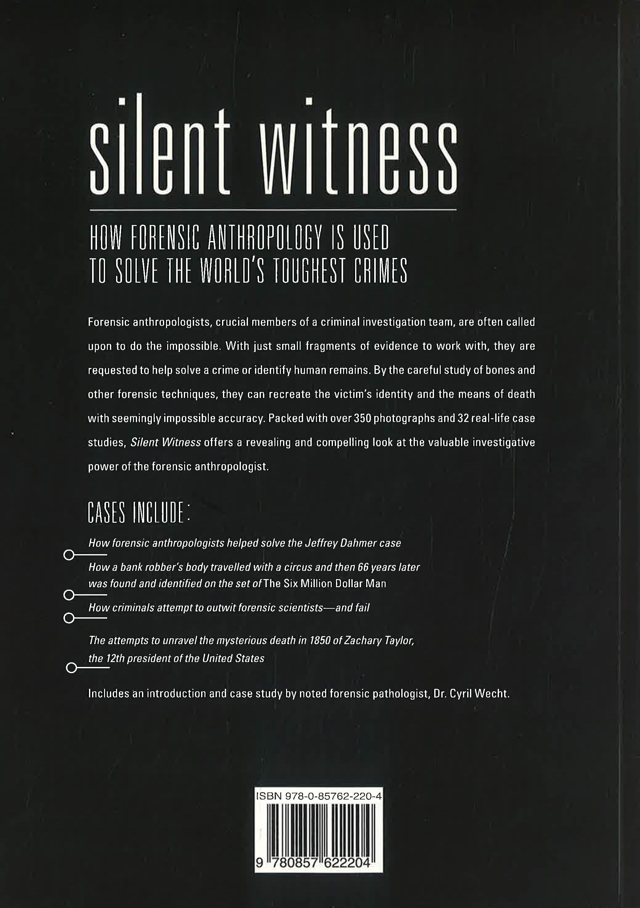 "Bones have an uncanny knack of holding important clues as to the fate of the individuals to whom they belonged." As portrayed in mystery novels and more than nine television shows including Crime Scene Investigation , American Justice and City Confidential , forensic anthropologists work in an environment where the stakes are high, the pressure is intense, and their findings are vital in criminal investigations. It's a fascinating and often dramatic world. Go behind the scenes with forensic anthropologists and learn about their techniques, how they locate a body, how they carefully uncover evidence, and how the unique characteristics of each body bears silent witness to age, sex, cause of death and clues as to who or what was responsible. With 29 real-life case studies and more than 350 color photographs and illustrations, Silent Witness is a fascinating read for anyone interested in the world of forensics.