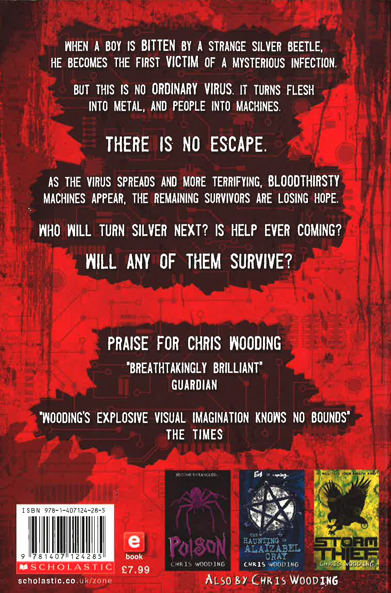 Perfect for fans of Michael Grant and Charlie Higson, this thrilling novel about a mysterious virus spreading through a boarding school is like 28 DAYS LATER meets ASSAULT ON PRECINCT THIRTEEN. Who will turn silver next? When a boy is bitten by a strange silver beetle, he becomes the first victim of a mysterious infection. But this is no ordinary virus. It turns flesh into metal, and pupils into machines. As the virus spreads and more terrifying, blood-thirsty machines appear, a small group manage to barricade themselves inside the school. Can they keep the machines at bay long enough for help to arrive? Is help even coming? Meanwhile the virus is spreading and its victims are changing...evolving...becoming stronger...The world as our heroes know it is turning silver. Will any of them survive?