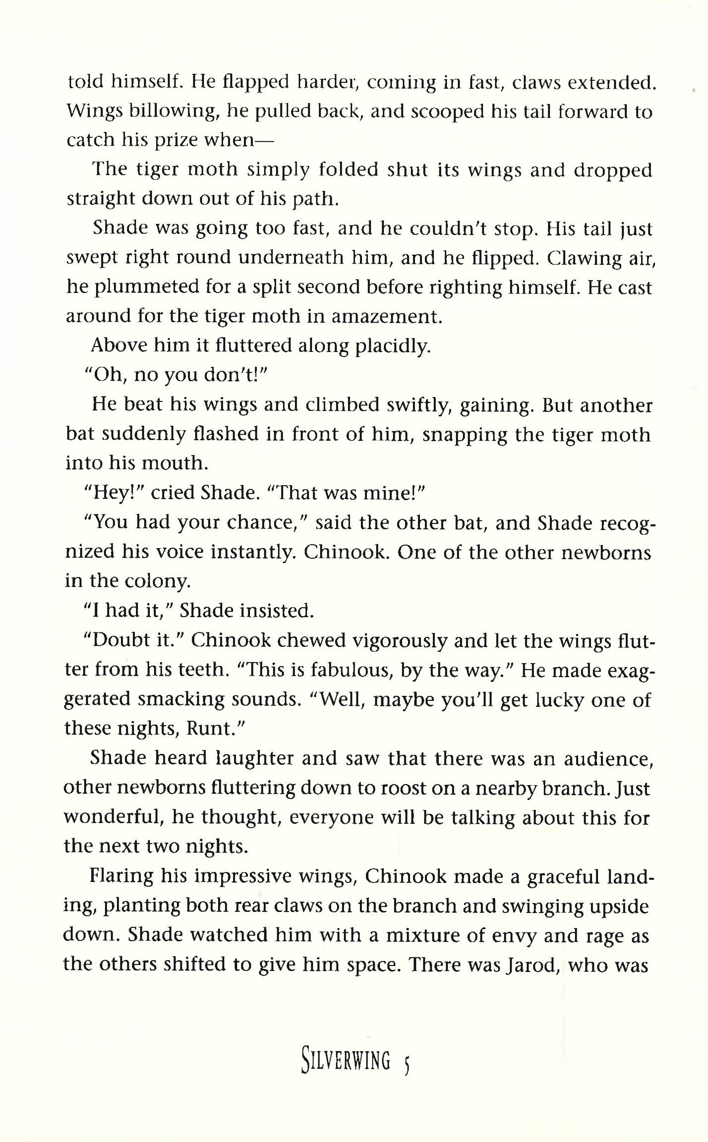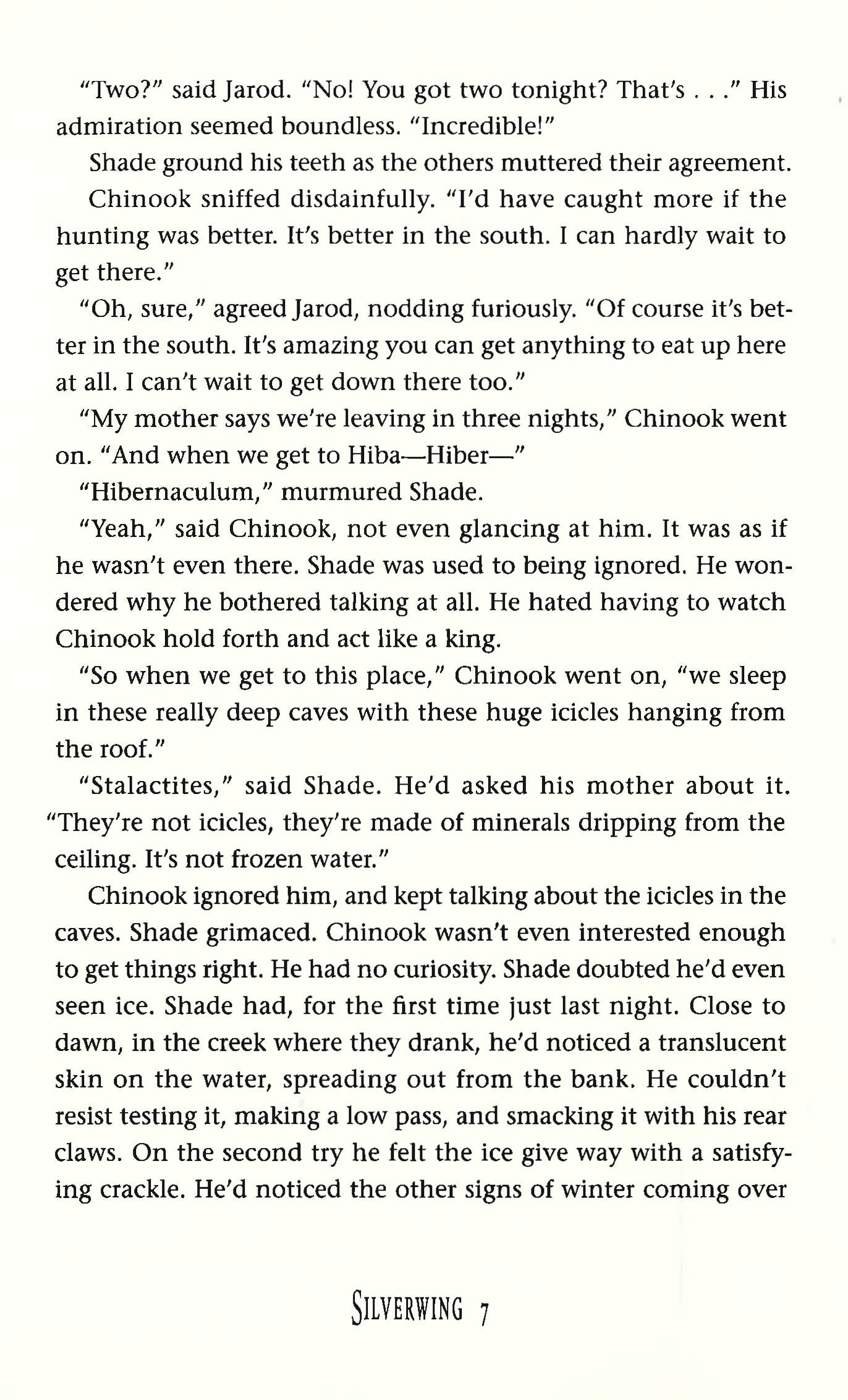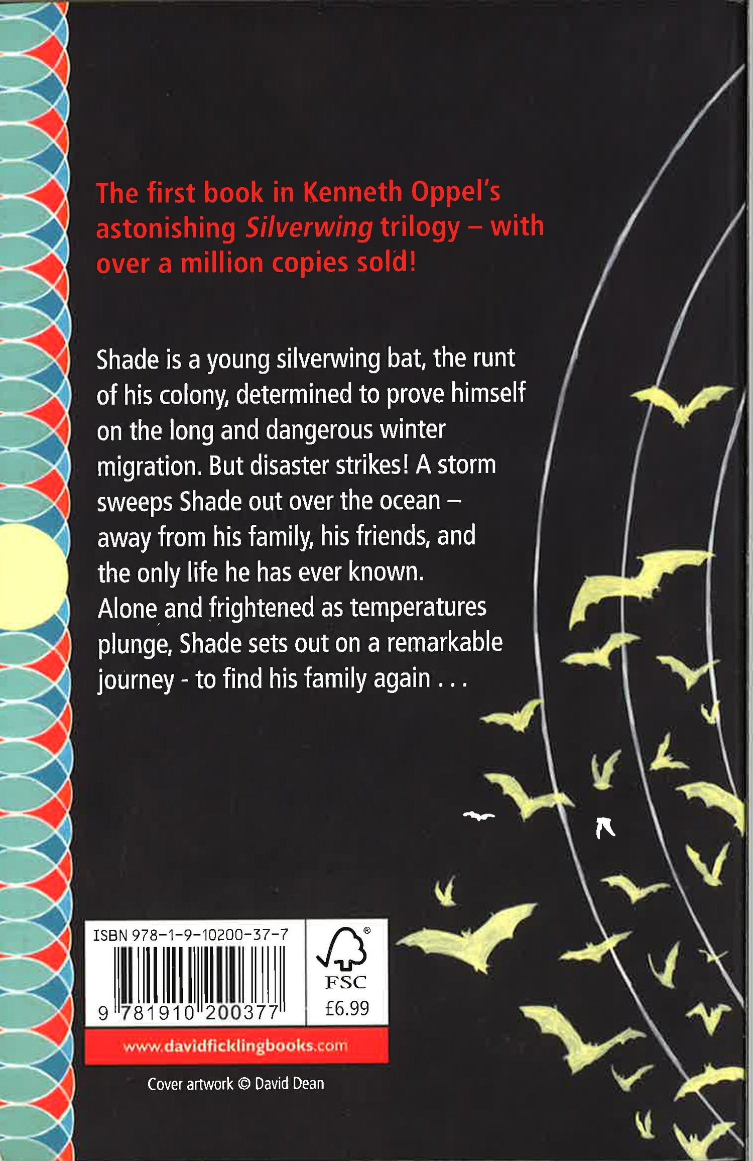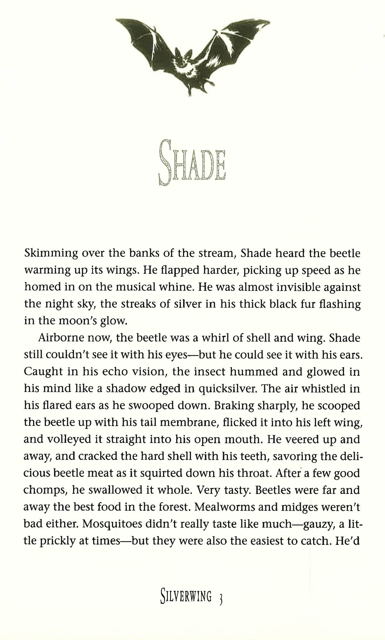 Shade is a young Silverwing bat, the runt of his colony. But he is determined to prove himself on the long and dangerous winter migration to Hibernaculum, millions of wingbeats to the south. During a torrential storm, Shade is swept away from his family, his friends, and the only life he has ever known. Alone and frightened as winter fast approaches and temperatures plunge, Shade must make a remarkable journey to rejoin his colony to the south.