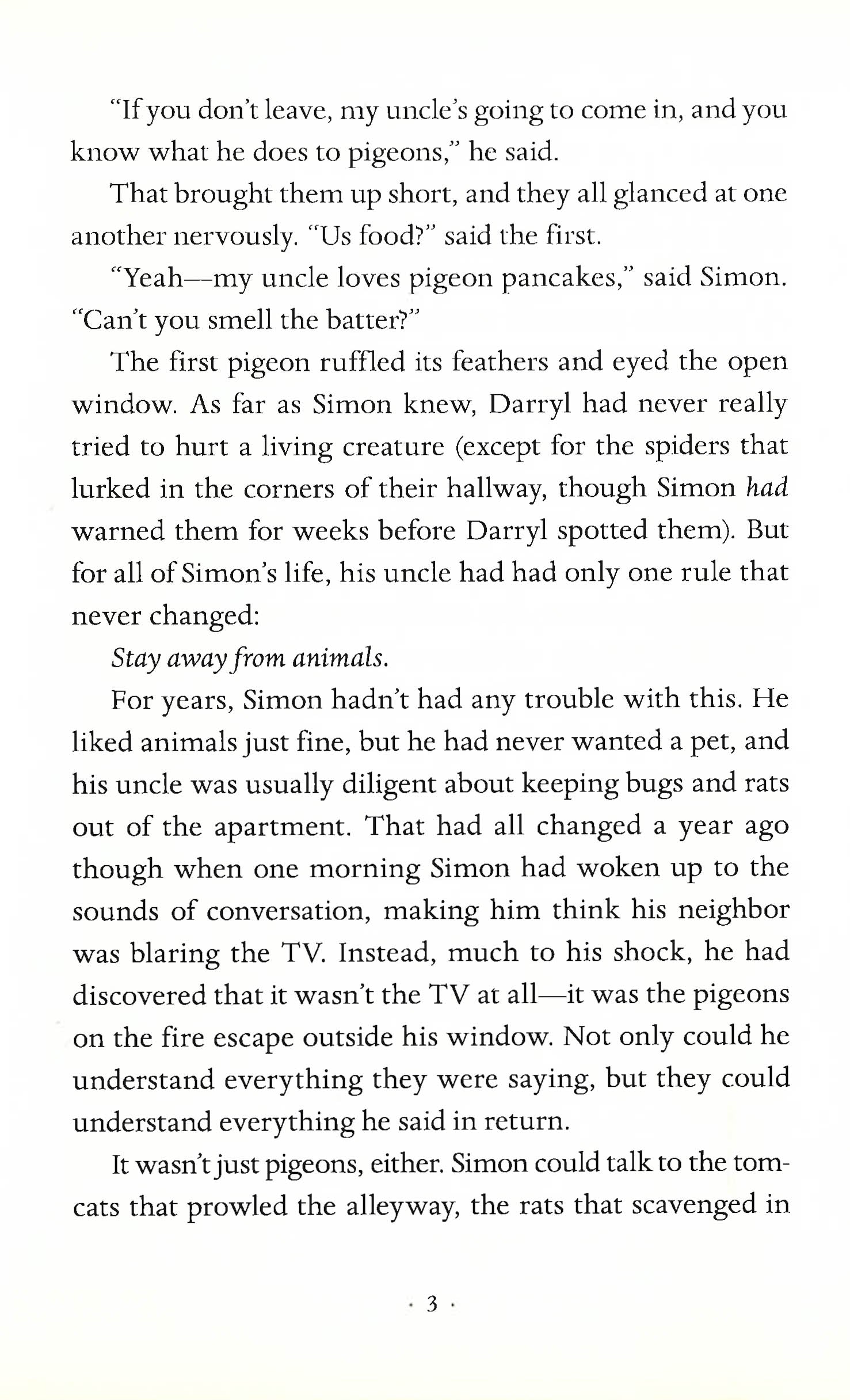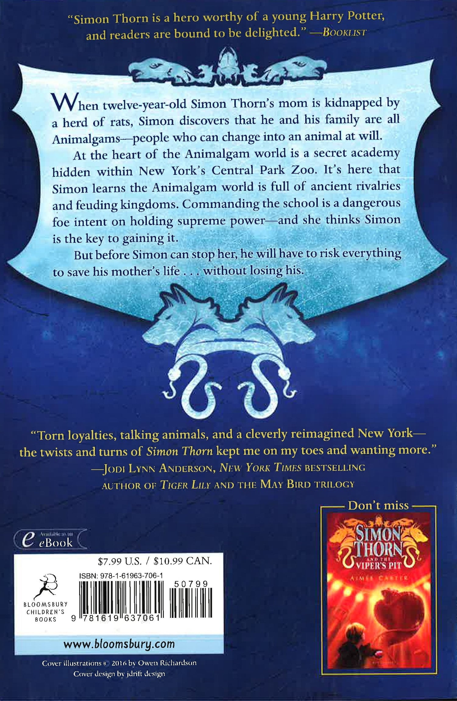 Twelve-year-old Simon Thorn's life has never been normal--especially since he's been keeping a big secret: he can talk to animals.But when his mom is suddenly kidnapped by a herd of New York City rats, Simon finds out that he, his mom, and his uncle are all Animalgams--someone born with the ability to change into an animal at will--and suddenly talking to animals doesn't seem so crazy after all.In search of his mom, Simon discovers that Animalgams belong to an ancient world made up of Five Animal Kingdoms (Mammals, Birds, Insects, Reptiles, and Underwater) which are now under attack . . . and Simon just may be the only one who can save them all.
