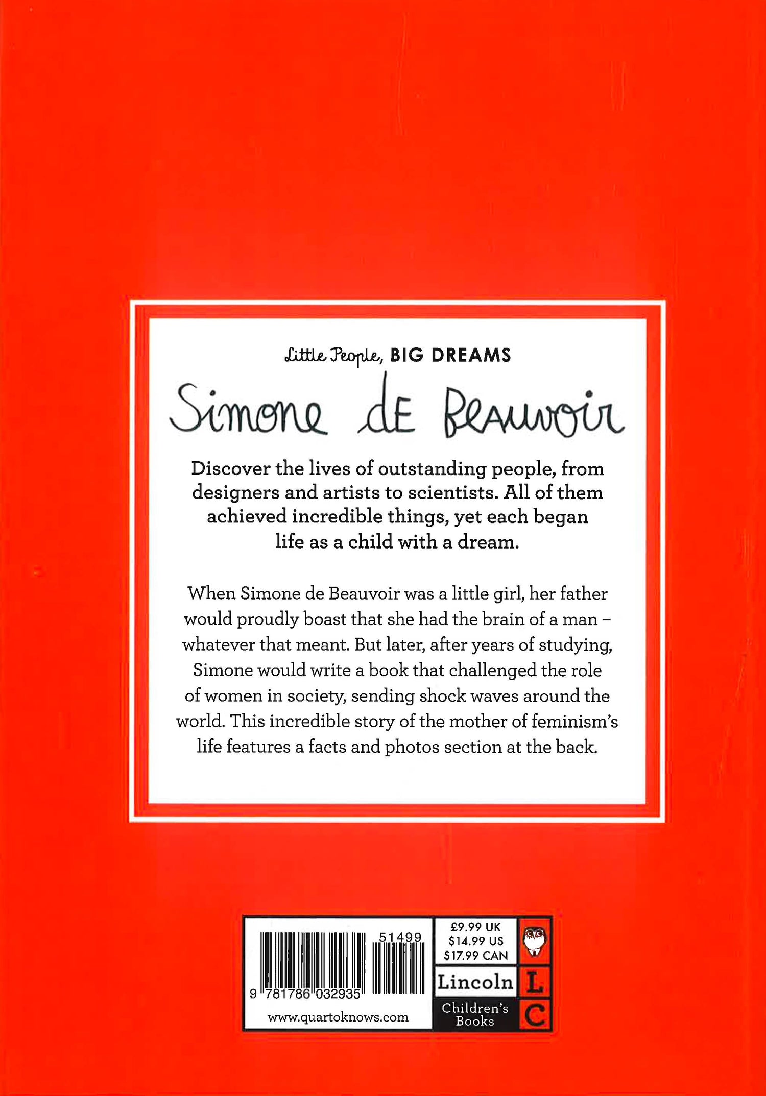 New in the critically acclaimed Little People, BIG DREAMS series, discover the incredible life of Simone de Beauvoir, the great French philosopher and mother of feminism. When Simone de Beauvoir was a little girl, her father would proudly boast that she had the brain of a man - whatever that meant. But later, after years of studying, Simone would write a book that challenged the role of women in society, sending shock waves around the world. This moving book features stylish and quirky illustrations and extra facts at the back, including a biographical timeline with historical photos and a detailed profile of the philosopher's life.Little People, BIG DREAMS is a bestselling series of books and educational games that explore the lives of outstanding people, from designers and artists to scientists and activists. All of them achieved incredible things, yet each began life as a child with a dream. This empowering series offers inspiring messages to children of all ages, in a range of formats. The board books are told in simple sentences, perfect for reading aloud to babies and toddlers. The hardback versions present expanded stories for beginning readers. Boxed gift sets allow you to collect a selection of the books by theme. Paper dolls, learning cards, matching games and other fun learning tools provide even more ways to make the lives of these role models accessible to children.Inspire the next generation of outstanding people who will change the world with Little People, BIG DREAMS!