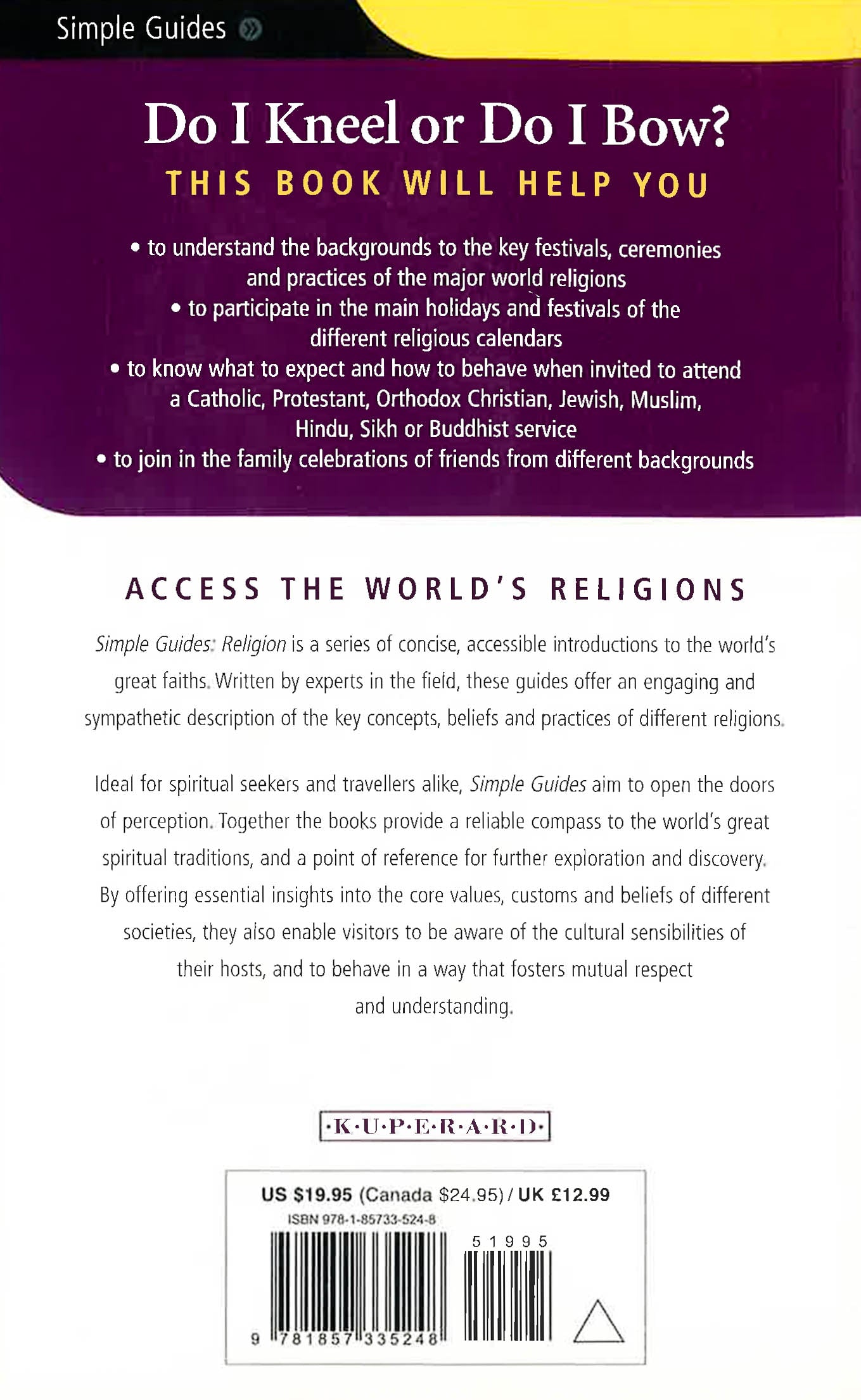 In today's multicultural society we are increasingly likely to meet and become friends with people from different religious backgrounds, and to find ourselves attending an unfamiliar ceremony. When this happens, there can be few of us who know exactly what to expect, or are confident about how to behave. This book will help you: - to understand the backgrounds to the key festivals, ceremonies, and practices of the major world religions - to participate in the main holidays and festivals of the different religious calendars - to know what to expect and how to behave when invited to attend a Protestant, Catholic, Christian Orthodox, Jewish, Muslim, Hindu, Sikh, or Buddhist service - to join in the family celebrations of friends from different backgrounds Armed with this basic information, you will feel relaxed enough to enjoy the occasion-and perhaps inspired to discover more about the spiritual world view of another cultural tradition. It is very easy to potentially give offence when you are unfamiliar with another's faith tradition. So here's some quick Top Tips: 1. Don't take alcohol to a Muslim celebration 2. Never point your feet at the Murti (sacred deity) in a Hindu Temple 3. Be prepared to stand for up to three hours at an Orthodox Christian wedding 4. Don't take flowers to a Jewish funeral 5. Keep your head covered at all times inside a Sikh Gurdwara (Temple) 6. Flowers are welcome at a Catholic or Protestant funeral 7. Be prepared to be gender segregated at a Muslim wedding 8. Cover your arms, legs and chest, but not your head, at a Buddhist Temple