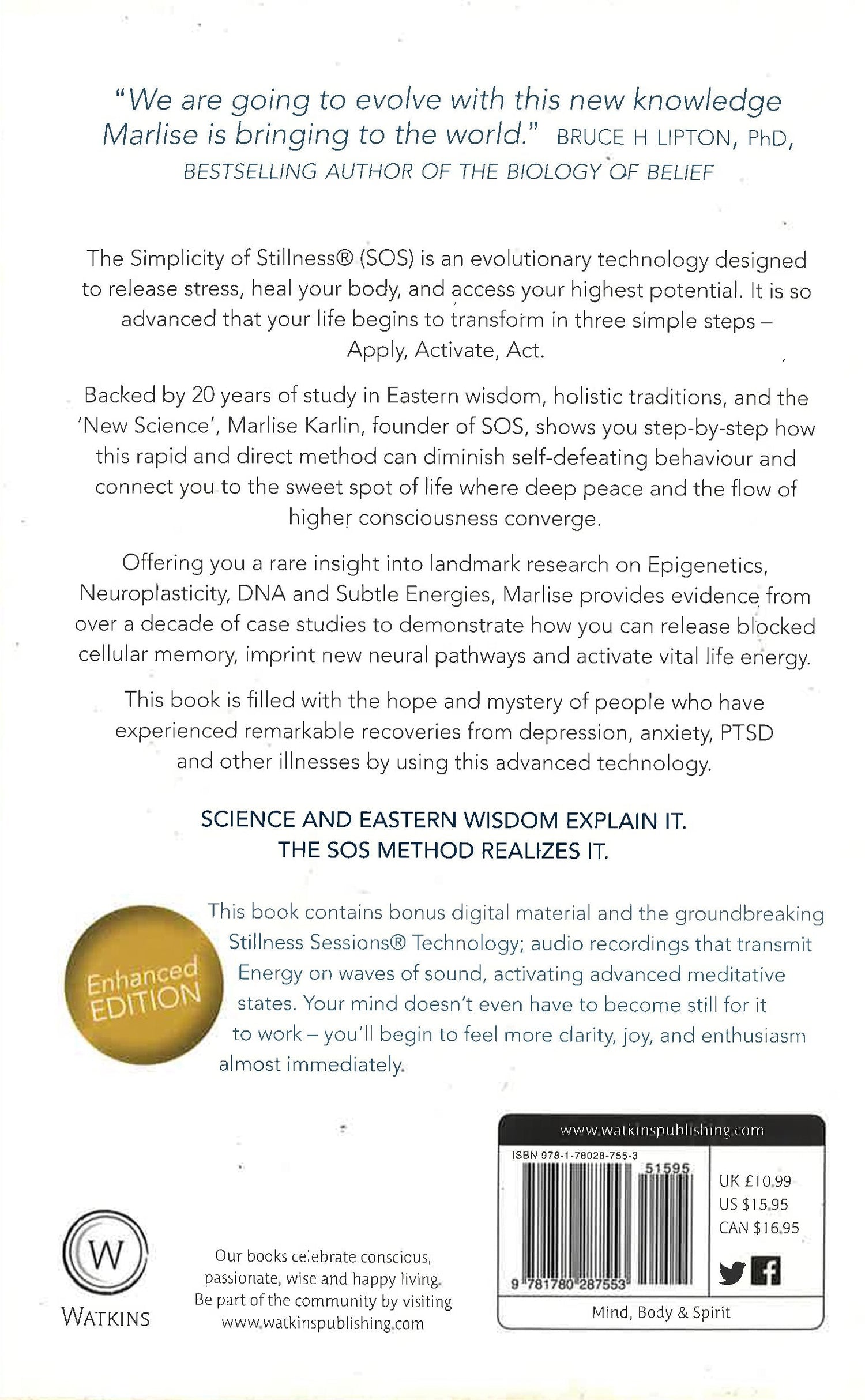 The Simplicity of Stillness® (SOS) is an evolutionary technology designed to release stress, heal your body, and access your highest potential. It is so advanced that your life begins to transform in three simple steps – Apply, Activate, Act.Backed by twenty years of study in Eastern wisdom, holistic traditions, and the "New Science," Marlise Karlin, founder of SOS, shows you step-by-step how this rapid and direct method can diminish self-defeating behavior and connect you to the sweet spot of life where deep peace and the flow of higher consciousness converge. Offering you a rare insight into landmark research on Epigenetics, Neuroplasticity, DNA and Subtle Energies, Marlise provides evidence from over a decade of case studies to demonstrate how you can release blocked cellular memory, imprint new neural pathways and activate vital life energy. This book is filled with the hope and mystery of people who have experienced remarkable recoveries from depression, anxiety, PTSD and other illnesses by using this advanced technology.