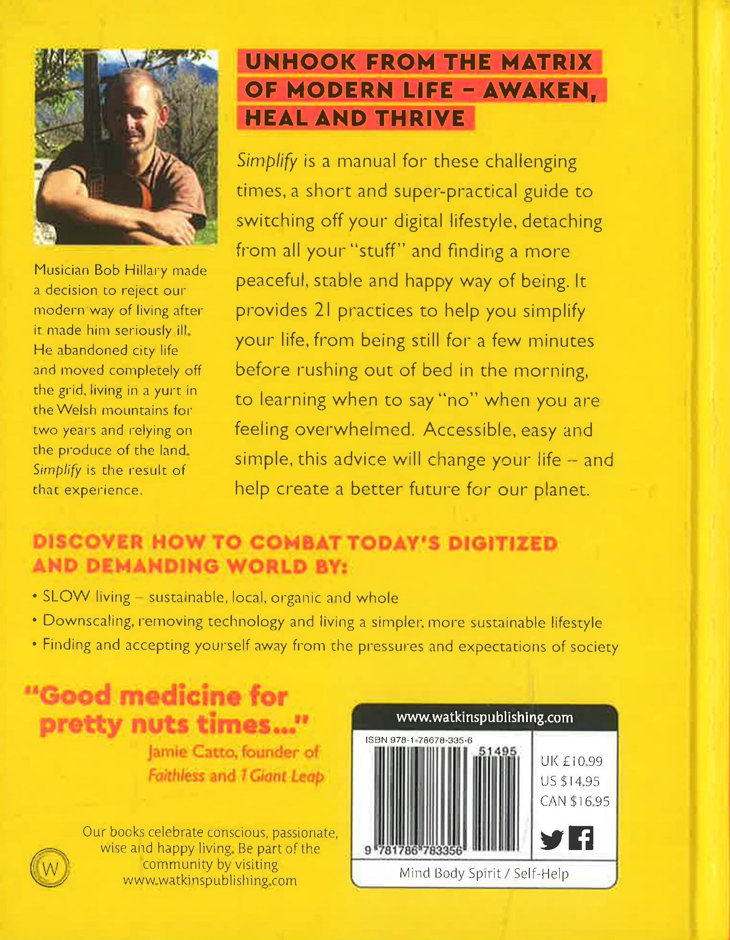 How can we live more simply, learn to appreciate what we have and root our way of being in the Earth we have inherited? By living simply and becoming an Earth Warrior. As life keeps urging us to go faster, many of us are moving in the opposite direction... we are looking for SLOWNESS, for stillness, to live more natural, less complex lives. Bob Hillary spent a year living off grid, an experience that taught him how to live simply. This meant downscaling, re-wilding, un-teching and finding and doing things that are free. These philosophies provided a framework for the 21 practices he shares in this book. They range from letting stillness be your friend to learning to say 'no' and practising gratitude, and they offer fun and practical ways for you to start making simple living part of your everyday life. Bob also looks at the crucial process of self-healing, which needs to take place so that you can fully embrace the book's closing section on action - how best to take the simple living message out into the world. This is a manual for modern times, teaching us how to be Earth Warriors and live in a more joyful, positive, meaningfully and above all simple way. It is guide to creating positive action, to walking the right path and making the right choices.