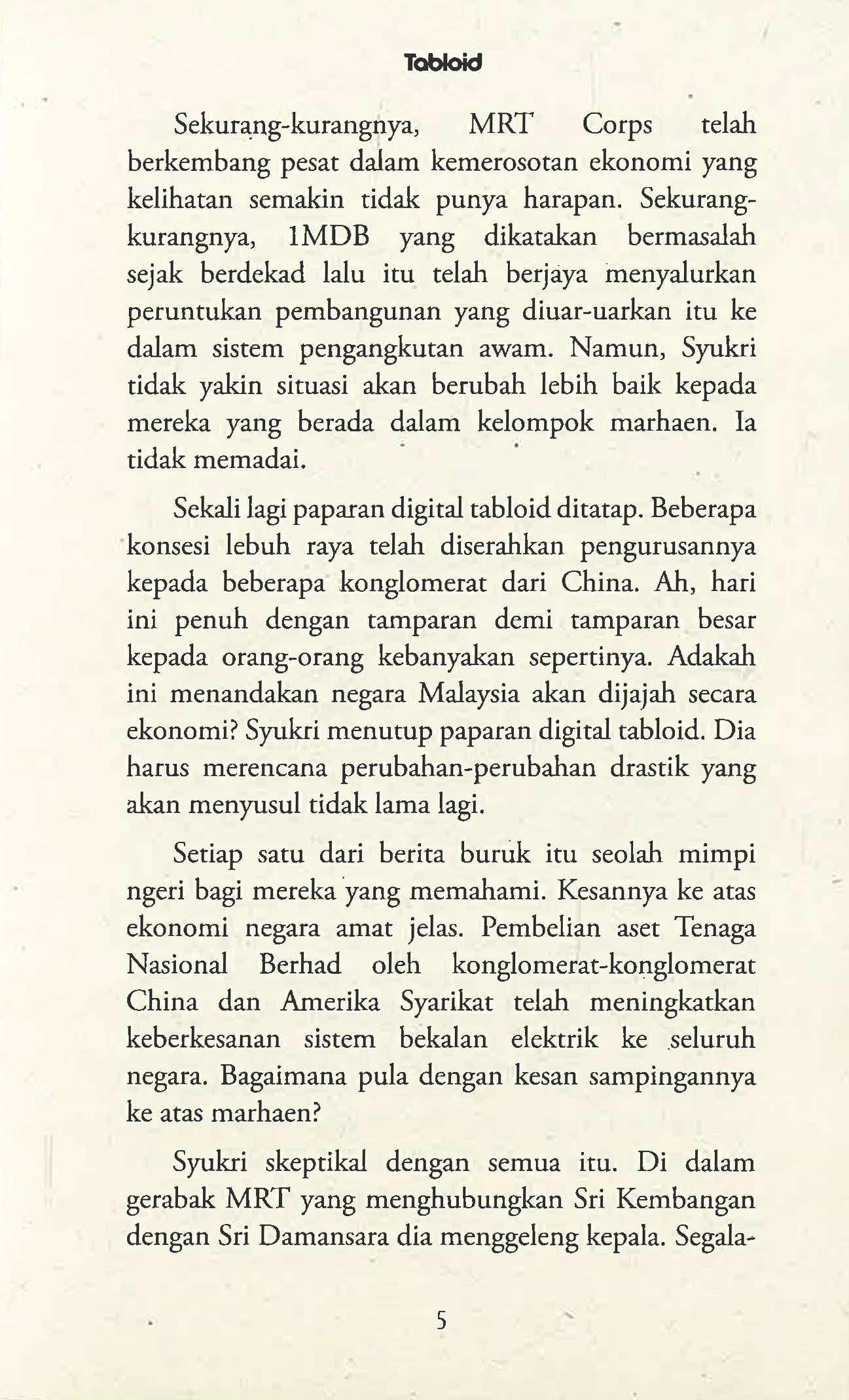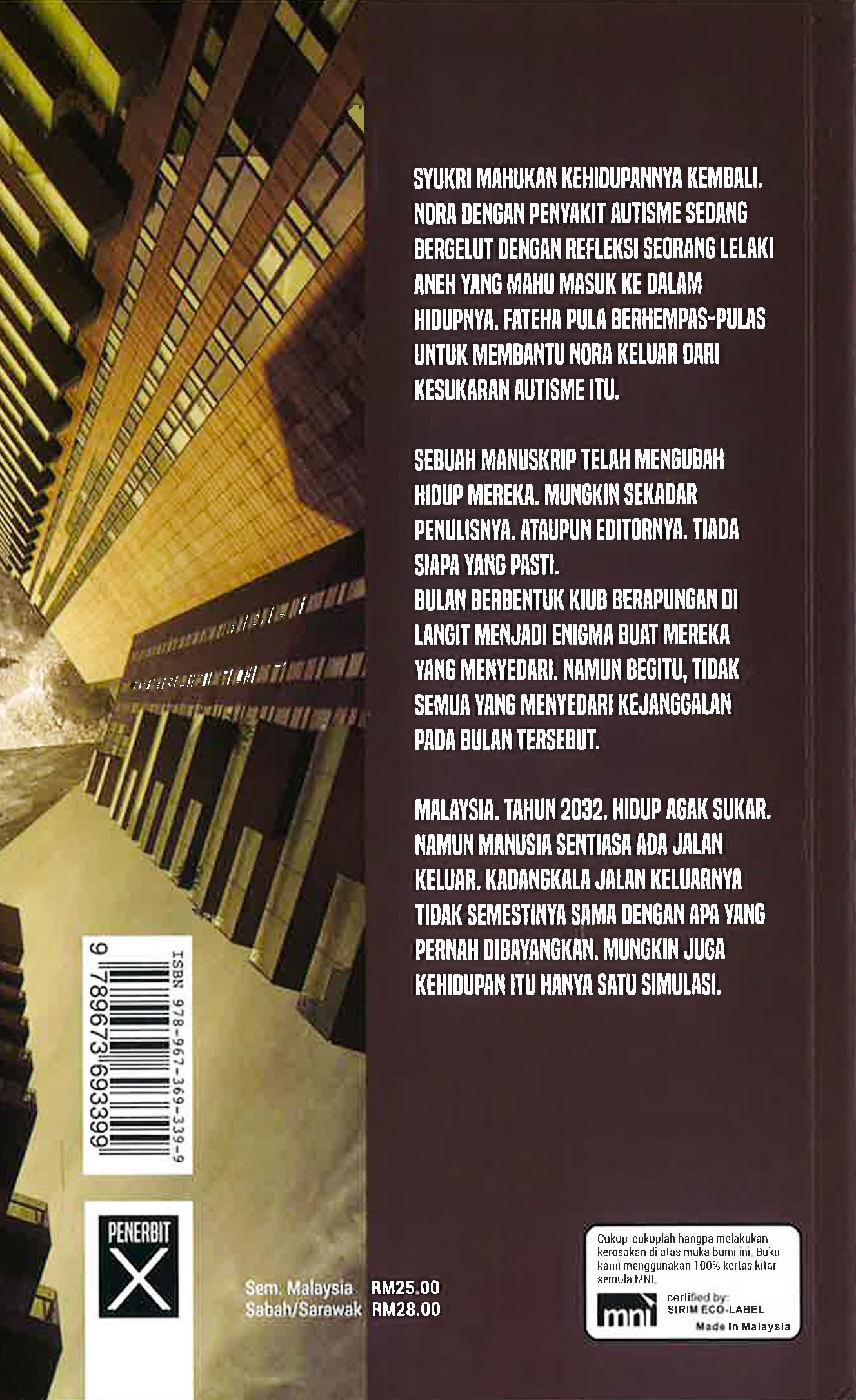 Syukri mahukan kehidupannya kembali. Nora dengan penyakit autisme sedang bergelut dengan refleksi seorang lelaki aneh yang mahu masuk ke dalam hidupnya. Fateha pula berhempas-pulas untuk membantu Nora keluar dari kesukaran autisme itu. Sebuah manuskrip telah mengubah hidup mereka. Mungkin sekadar penulisnya. Ataupun editornya. Tiada siapa yang pasti. Bulan berbentuk kiub berapungan di langit menjadi enigma buat mereka yang menyedari. Namun begitu, tidak semua yang menyedari kejanggalan pada bulan tersebut. Malaysia. Tahun 2032. Hidup agak sukar. Namun manusia sentiasa ada jalan keluar. Kadangkala jalan keluarnya tidak semestinya sama dengan apa yang pernah dibayangkan. Mungkin juga kehidupan itu hanya satu simulasi.