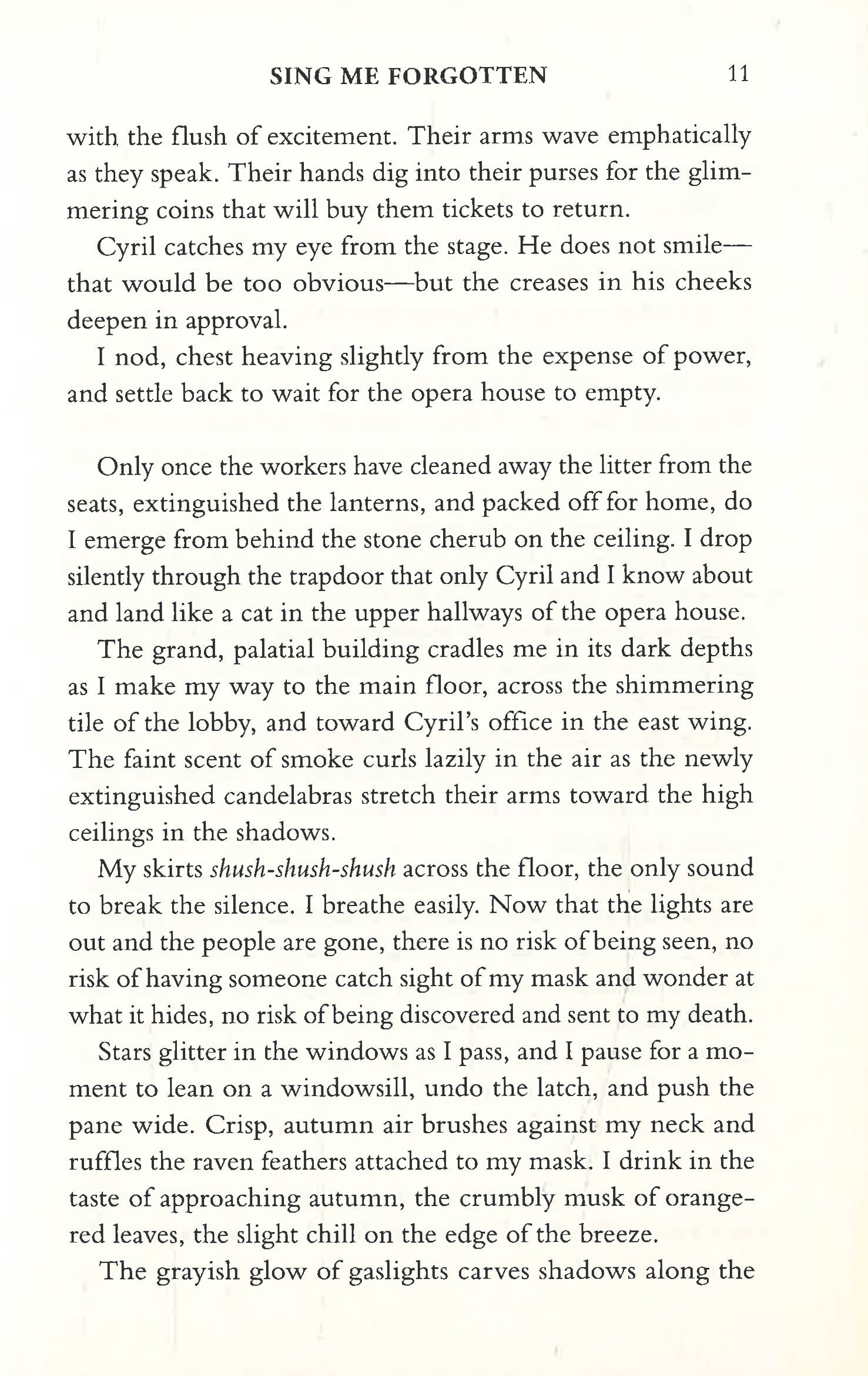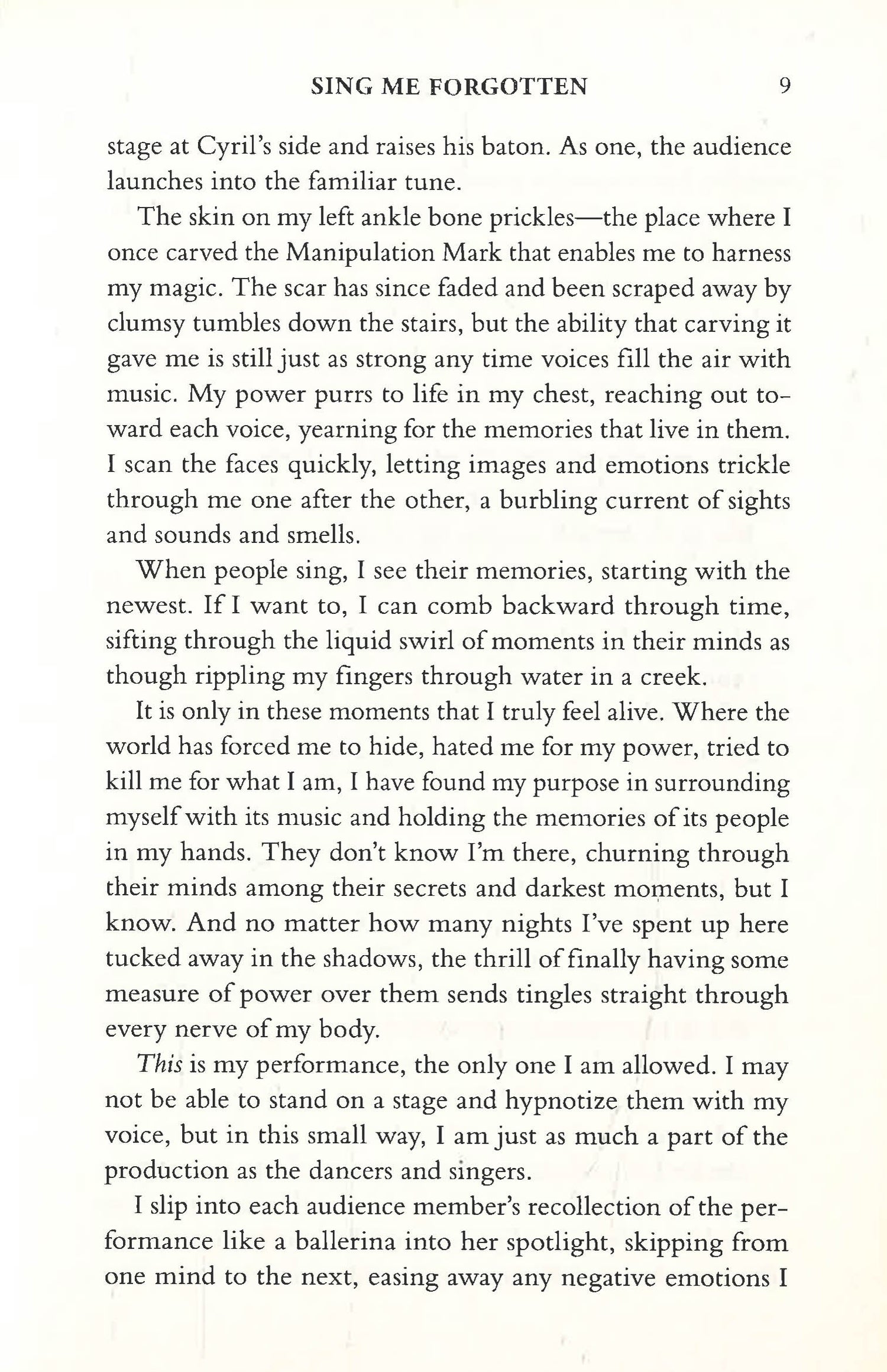 Cast into a well at birth for being one of the magical few who can manipulate memories when people sing, she was saved by Cyril, the opera house’s owner. Since that day, he has given her sanctuary from the murderous world outside. All he asks in return is that she use her power to keep ticket sales high—and that she stay out of sight. For if anyone discovers she survived, Isda and Cyril would pay with their lives.