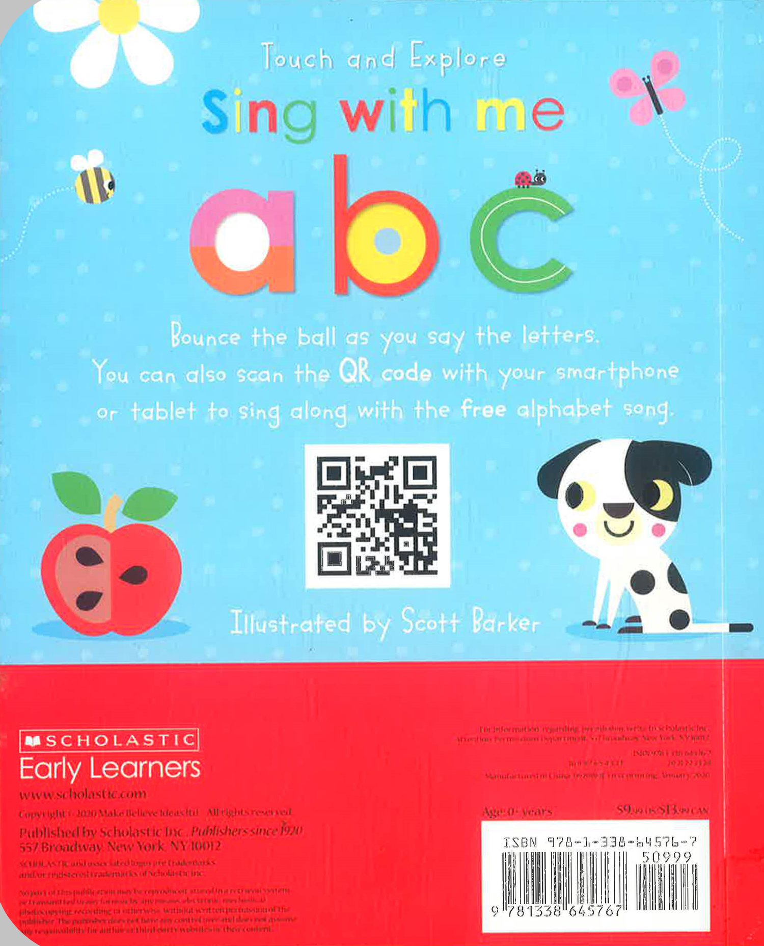 Learn to sing your ABCs with this fun board book! Interactive sliders on every page guide the reader through the alphabet, and a QR code on the back links to the alphabet song. The large format is perfect for toddler hands, and the bright artwork will keep children engaged as they learn. An engaging first alphabet book! Scholastic Early Learners: Interactive books for hands-on learning. Perfect for babies, toddlers, preschoolers, kindergartners, and first graders, too!