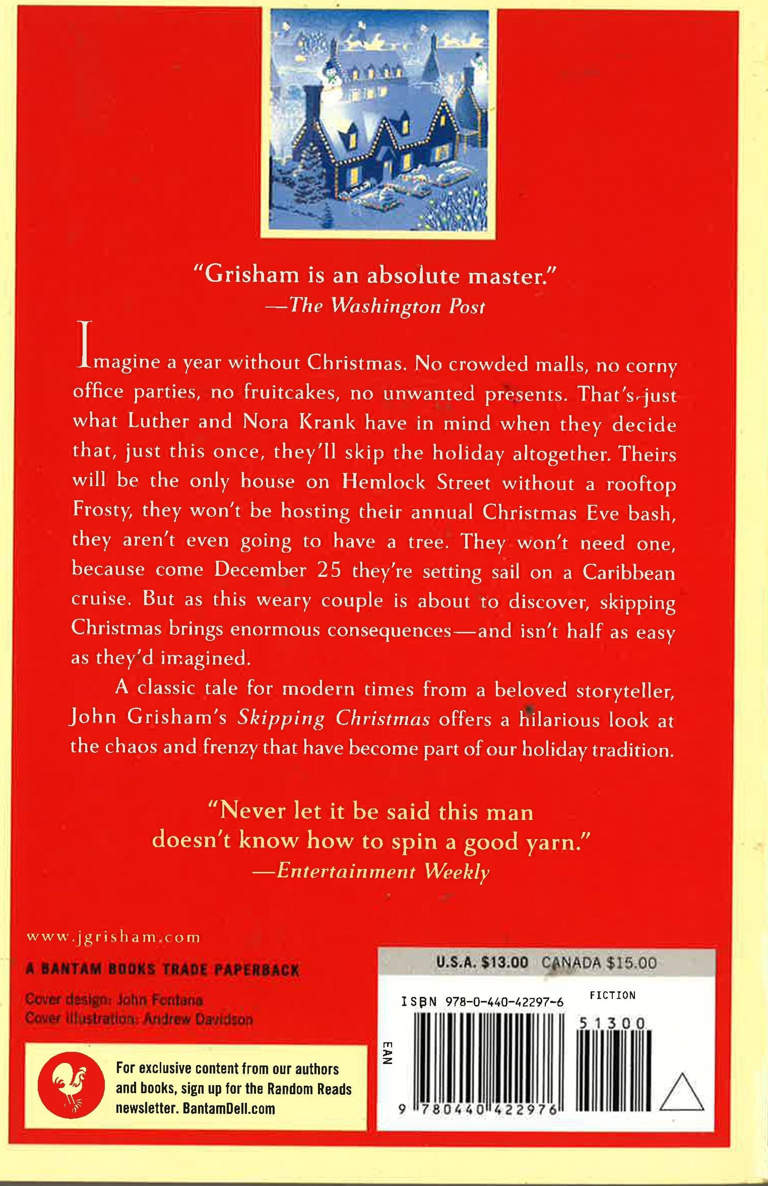 #1 NEW YORK TIMES BESTSELLER Imagine a year without Christmas. No crowded malls, no corny office parties, no fruitcakes, no unwanted presents. That's just what Luther and Nora Krank have in mind when they decide that, just this once, they'll skip the holiday altogether. Theirs will be the only house on Hemlock Street without a rooftop Frosty, they won't be hosting their annual Christmas Eve bash, they aren't even going to have a tree. They won't need one, because come December 25 they're setting sail on a Caribbean cruise. But as this weary couple is about to discover, skipping Christmas brings enormous consequences--and isn't half as easy as they'd imagined. A classic tale for modern times from a beloved storyteller, John Grisham's Skipping Christmas offers a hilarious look at the chaos and frenzy that have become part of our holiday tradition.