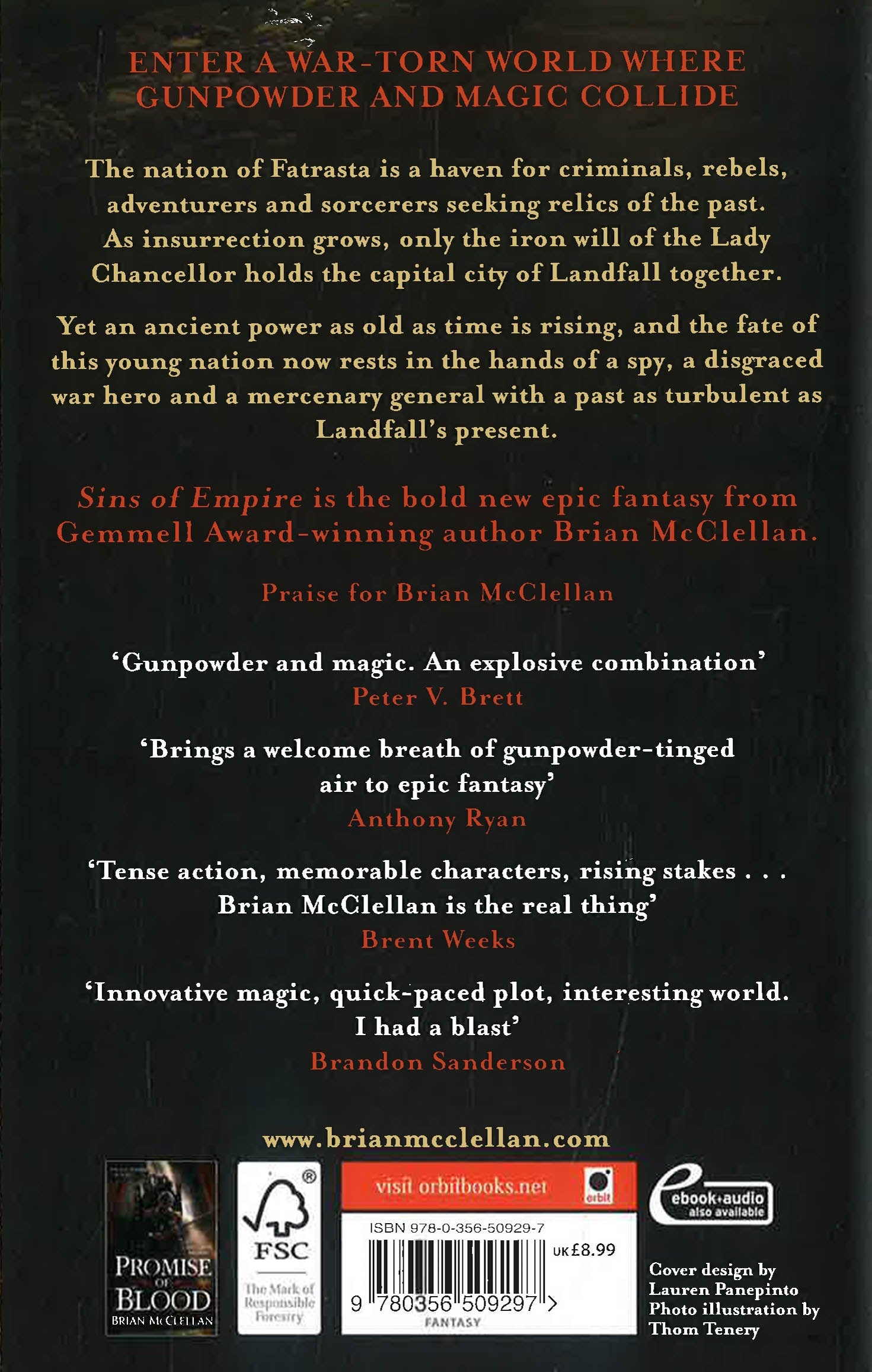 The nation of Fatrasta is a haven for criminals, rebels, adventurers and sorcerers seeking relics of the past. As insurrection grows, only the iron will of the Lady Chancellor holds the capital city of Landfall together. Yet an ancient power as old as time is rising, and the fate of this young nation now rests in the hands of a spy, a disgraced war hero and a mercenary general with a past as turbulent as Landfall's present.
