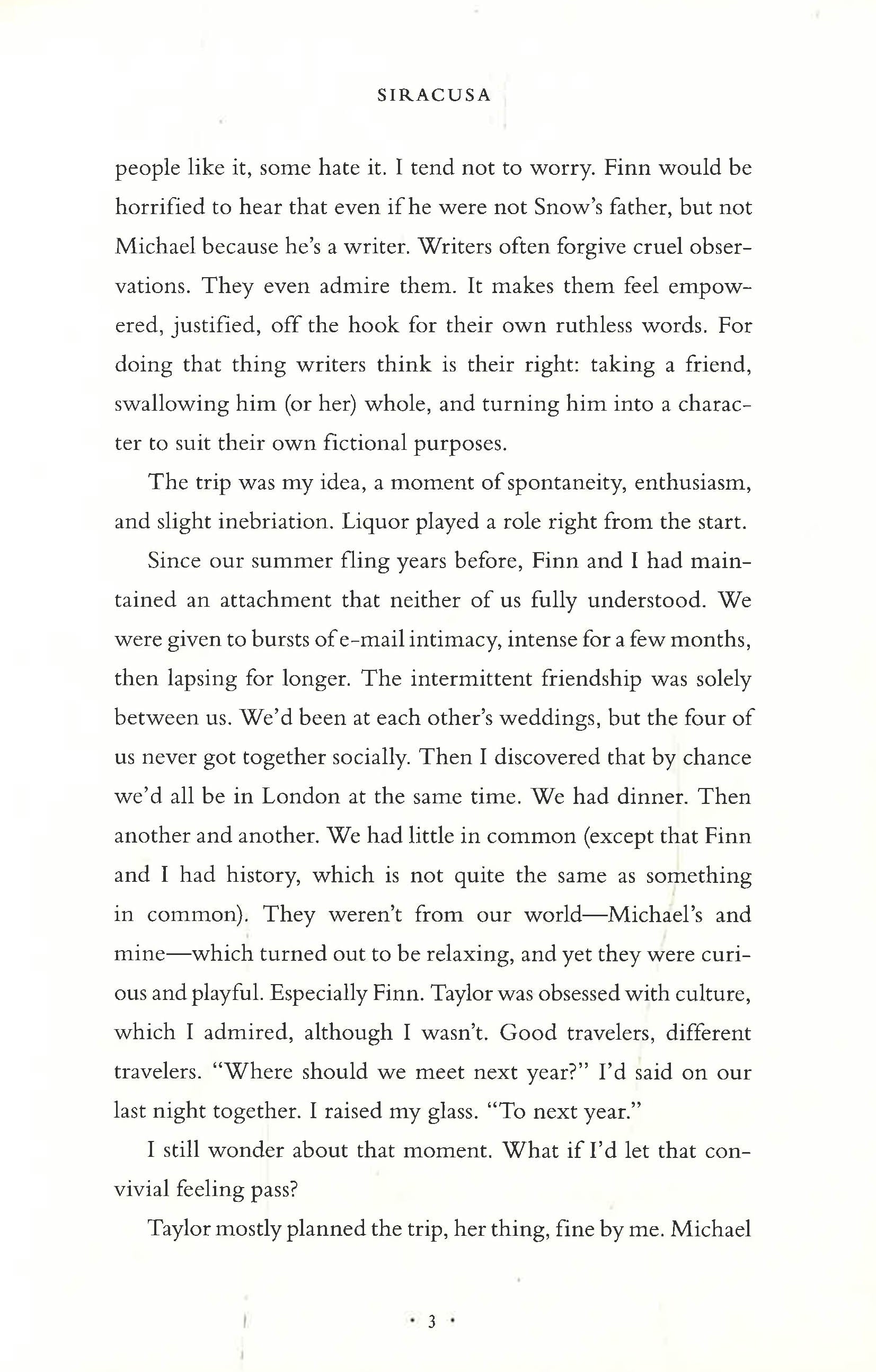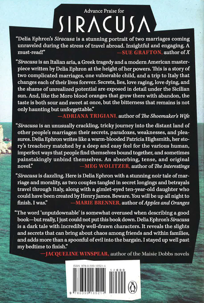 An electrifying novel about marriage and deceit from bestselling author Delia Ephron that follows two couples on vacation in Siracusa, a town on the coast of Sicily, where the secrets they have hidden from one another are exposed and relationships are unraveled. New Yorkers Michael, a famous writer, and Lizzie, a journalist, travel to Italy with their friends from Maine--Finn; his wife, Taylor; and their daughter, Snow. "From the beginning," says Taylor, "it was a conspiracy for Lizzie and Finn to be together." Told Rashomon-style in alternating points of view, the characters expose and stumble upon lies and infidelities past and present. Snow, ten years old and precociously drawn into a far more adult drama, becomes the catalyst for catastrophe as the novel explores collusion and betrayal in marriage. With her inimitable psychological astute-ness and uncanny understanding of the human heart, Ephron delivers a powerful meditation on marriage, friendship, and the meaning of travel. Set on the sun-drenched coast of the Ionian Sea, Siracusa unfolds with the pacing of a psychological thriller and delivers an unexpected final act that none will see coming.