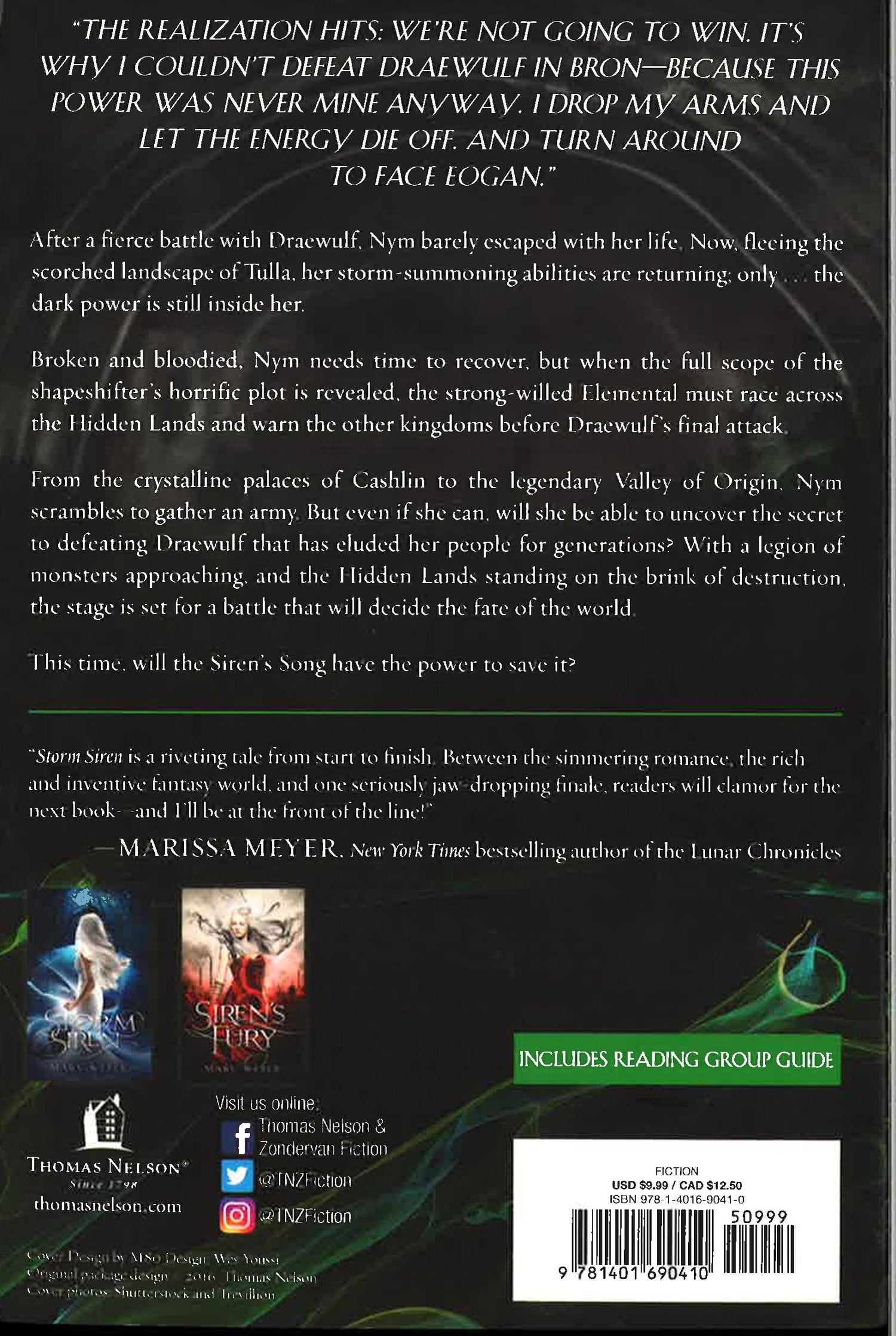 After a fierce battle with Draewulf, Nym barely escaped with her life. Now, fleeing the scorched landscape of Tulla, her storm-summoning abilities are returning; only . . . the dark power is still inside her.Broken and bloodied, Nym needs time to recover, but when the full scope of the shapeshifter's horrific plot is revealed, the strong-willed Elemental must race across the Hidden Lands and warn the other kingdoms before Draewulf's final attack.From the crystalline palaces of Cashlin to the legendary Valley of Origin, Nym scrambles to gather an army. But even if she can, will she be able to uncover the secret to defeating Draewulf that has eluded her people for generations? With a legion of monsters approaching, and the Hidden Lands standing on the brink of destruction, the stage is set for a battle that will decide the fate of the world.This time, will the Siren's Song have the power to save it?
