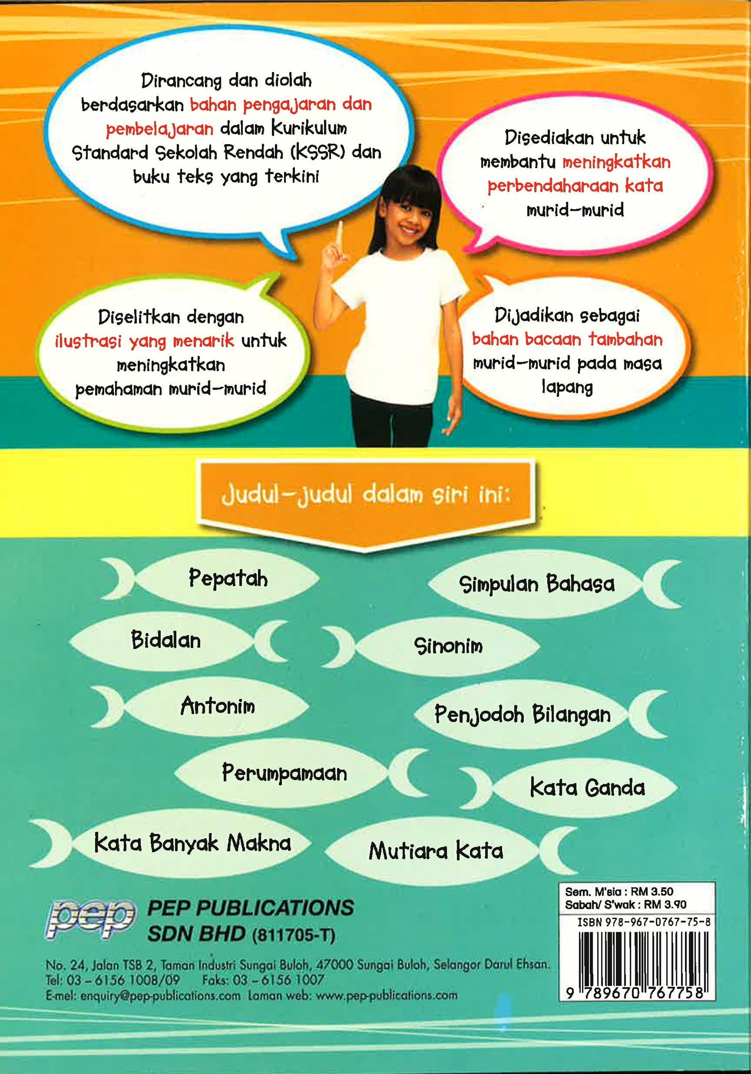 Dirancang dan diolah berdasarkan bahan pengajaran dan pembelajaran dalam Kurikulum Standard Sekolah Rendah (KSSR) dan buku teks yang terkini. Disediakan untuk membantu meningkatkan perbendaharaan kata murid-murid. Dijadikan sebagai bahan bacaan tambahan murid-murid pada masa lapang. Diselitkan dengan ilustrasi yang menarik untuk meningkatkan pemahaman murid-murid.