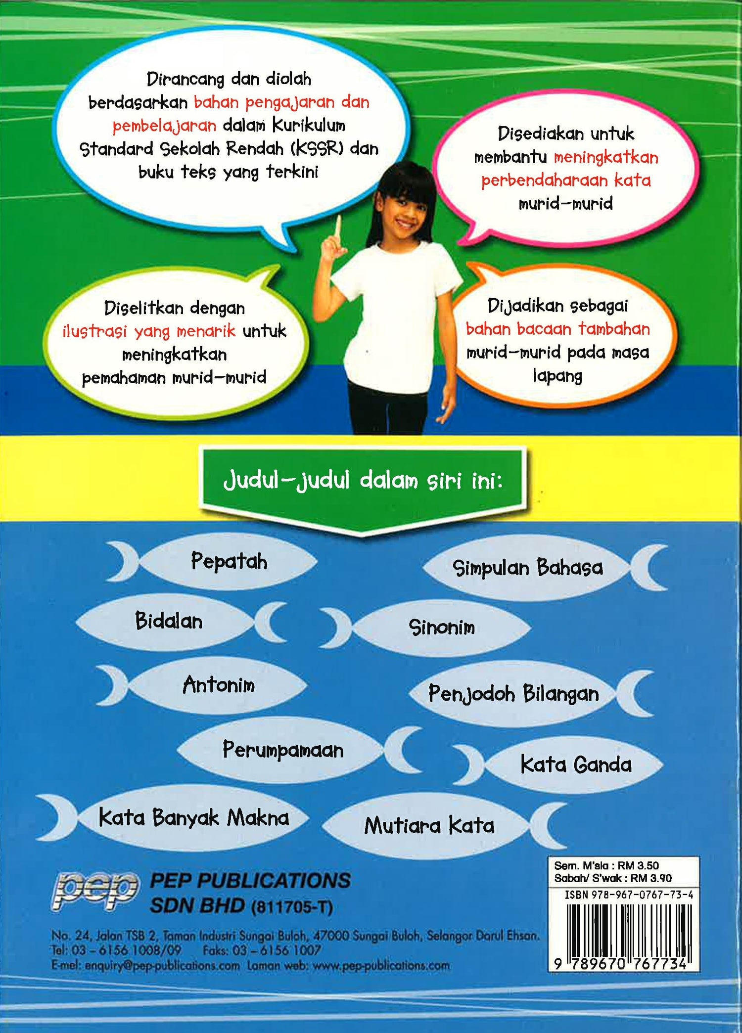 Dirancang dan diolah berdasarkan bahan pengajaran dan pembelajaran dalam Kurikulum Standard Sekolah Rendah (KSSR) dan buku teks yang terkini. Disediakan untuk membantu meningkatkan perbendaharaan kata murid-murid. Dijadikan sebagai bahan bacaan tambahan murid-murid pada masa lapang. Diselitkan dengan ilustrasi yang menarik untuk meningkatkan pemahaman murid-murid.