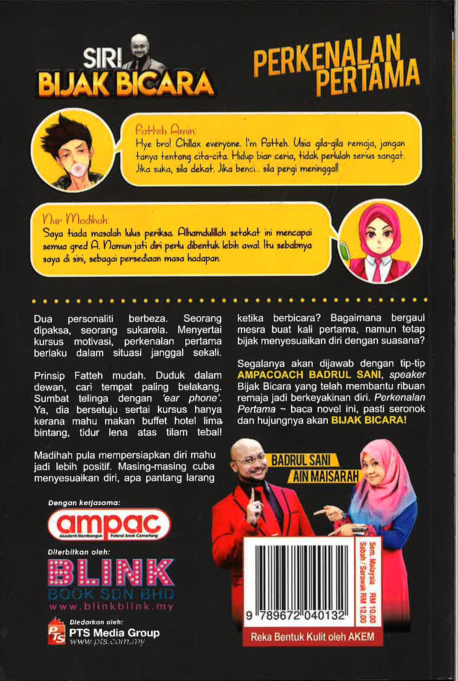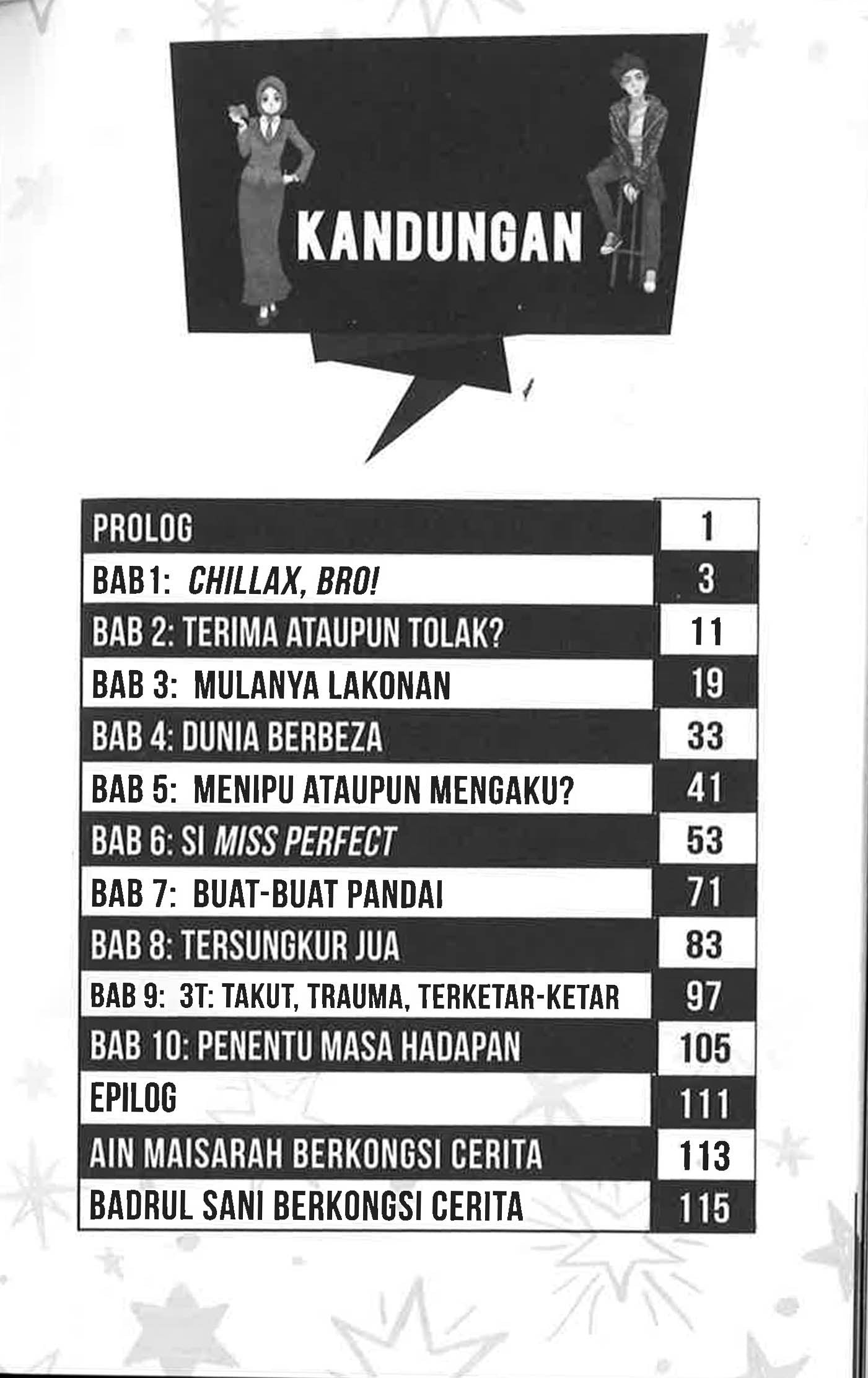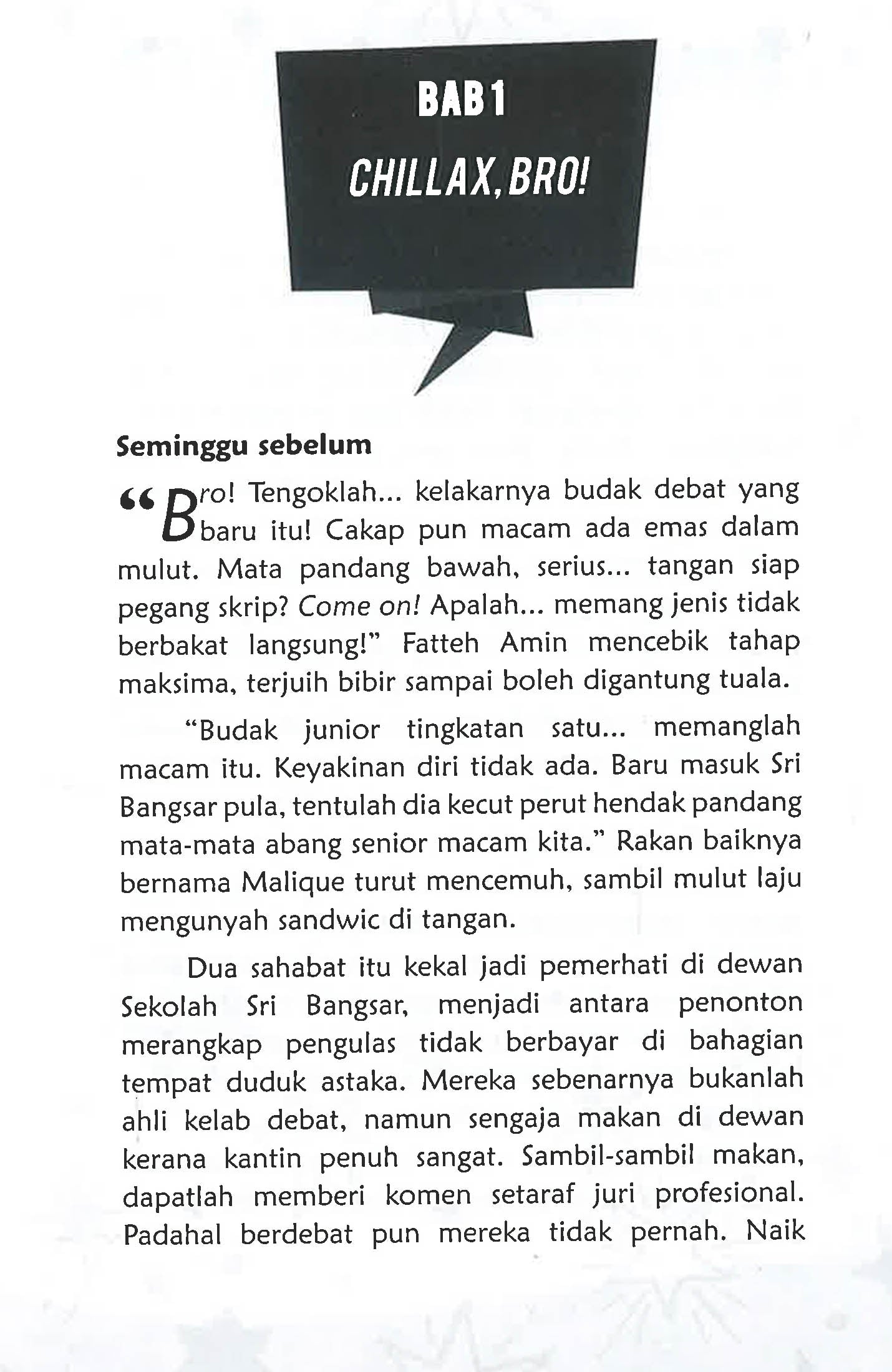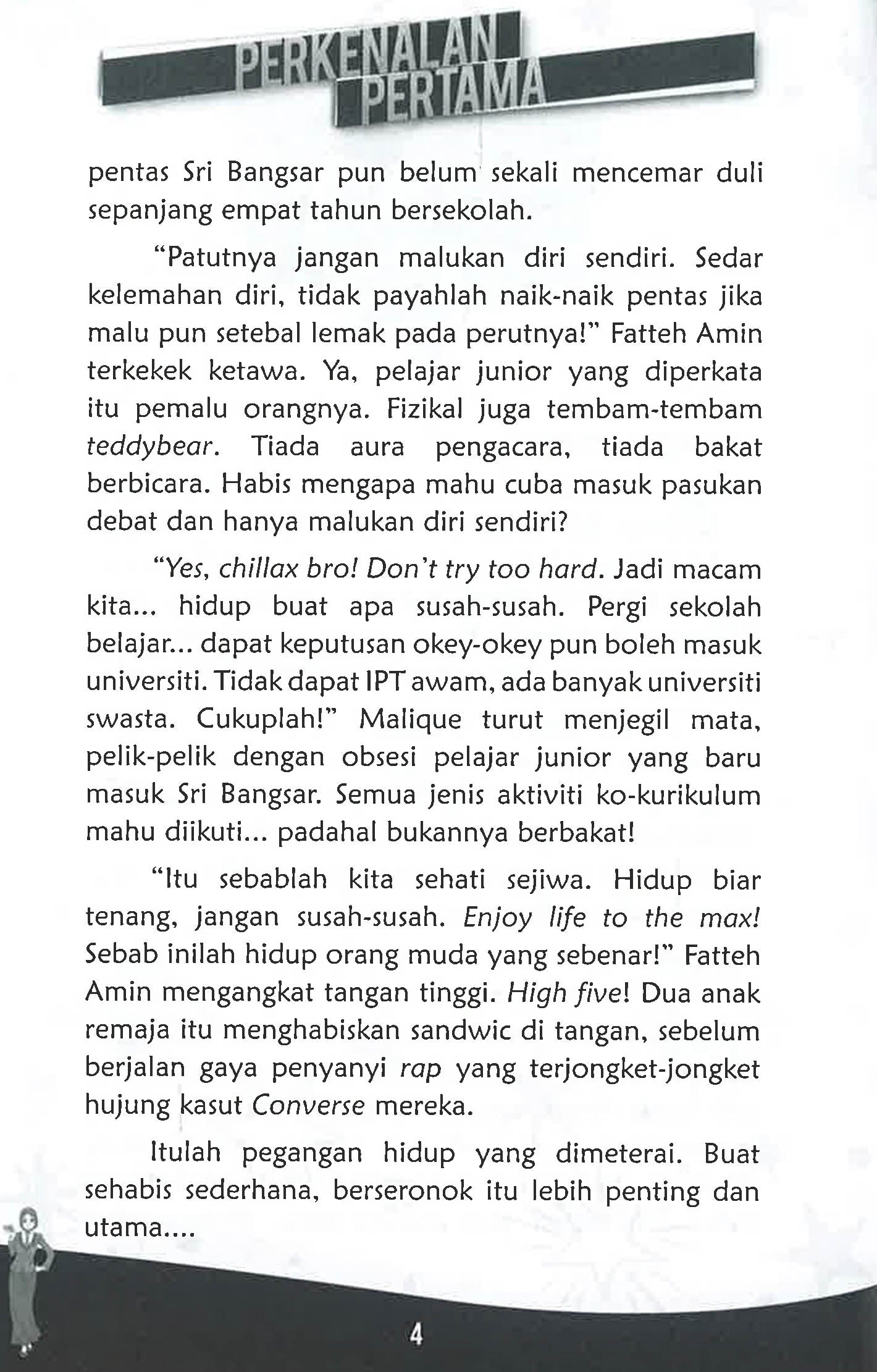 Fatteh Amin: Hye bro! Chillax everyone. I’m Fatteh. Usia gila-gila remaja, jangan tanya tentang cita-cita. Hidup biar ceria, tidak perlulah serius sangat. Jika suka, sila dekat. Jika benci… sila pergi meninggal! Nur Madihah: Saya tiada masalah lulus periksa. Alhamdulillah setakat ini mencapai semua gred A. Namun jati diri perlu dibentuk lebih awal. Itu sebabnya saya di sini, sebagai persediaan masa hadapan.