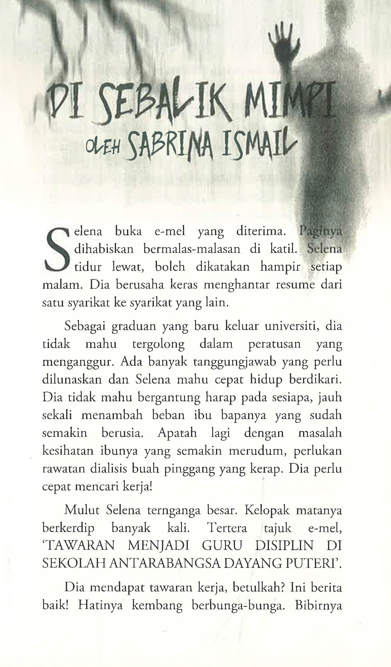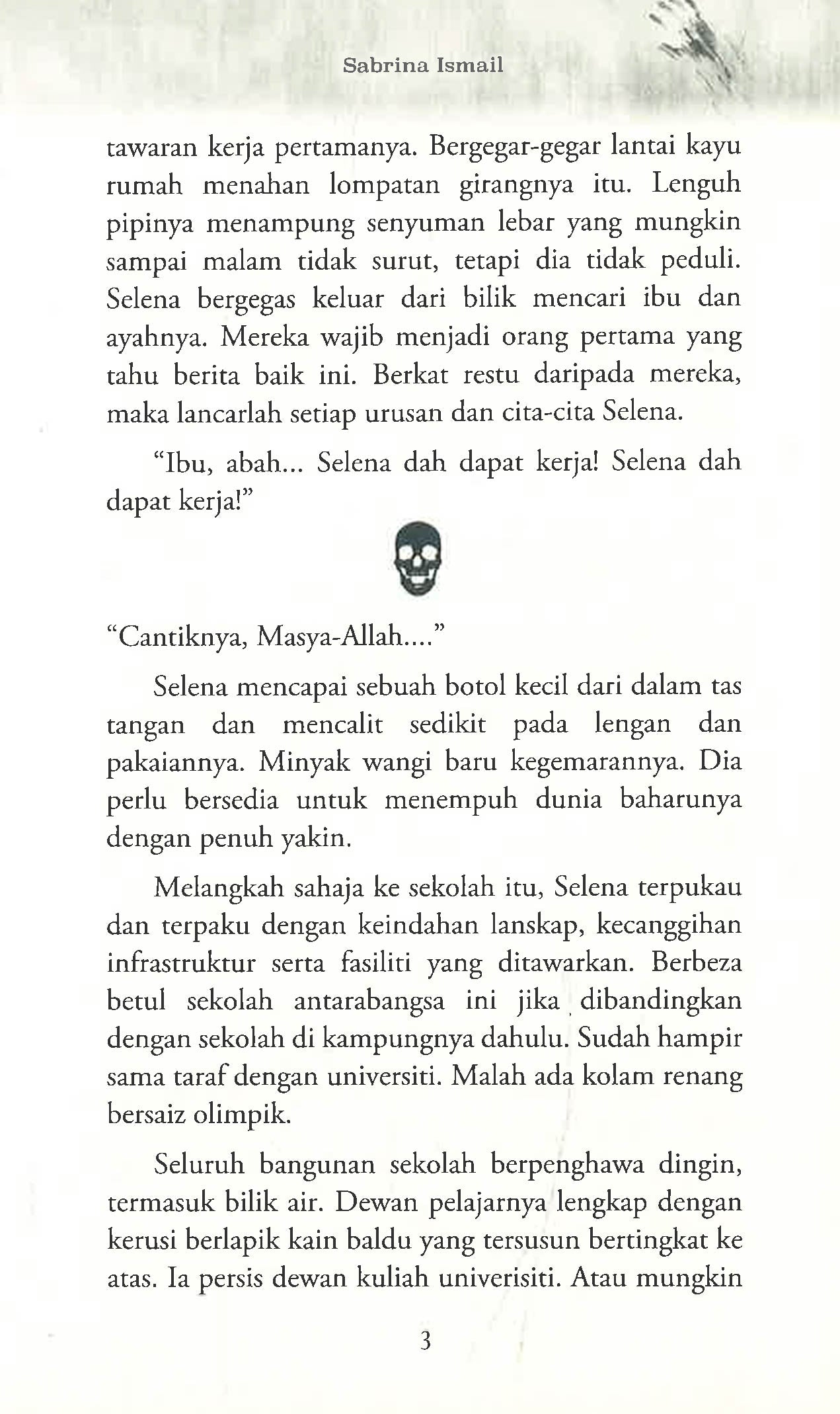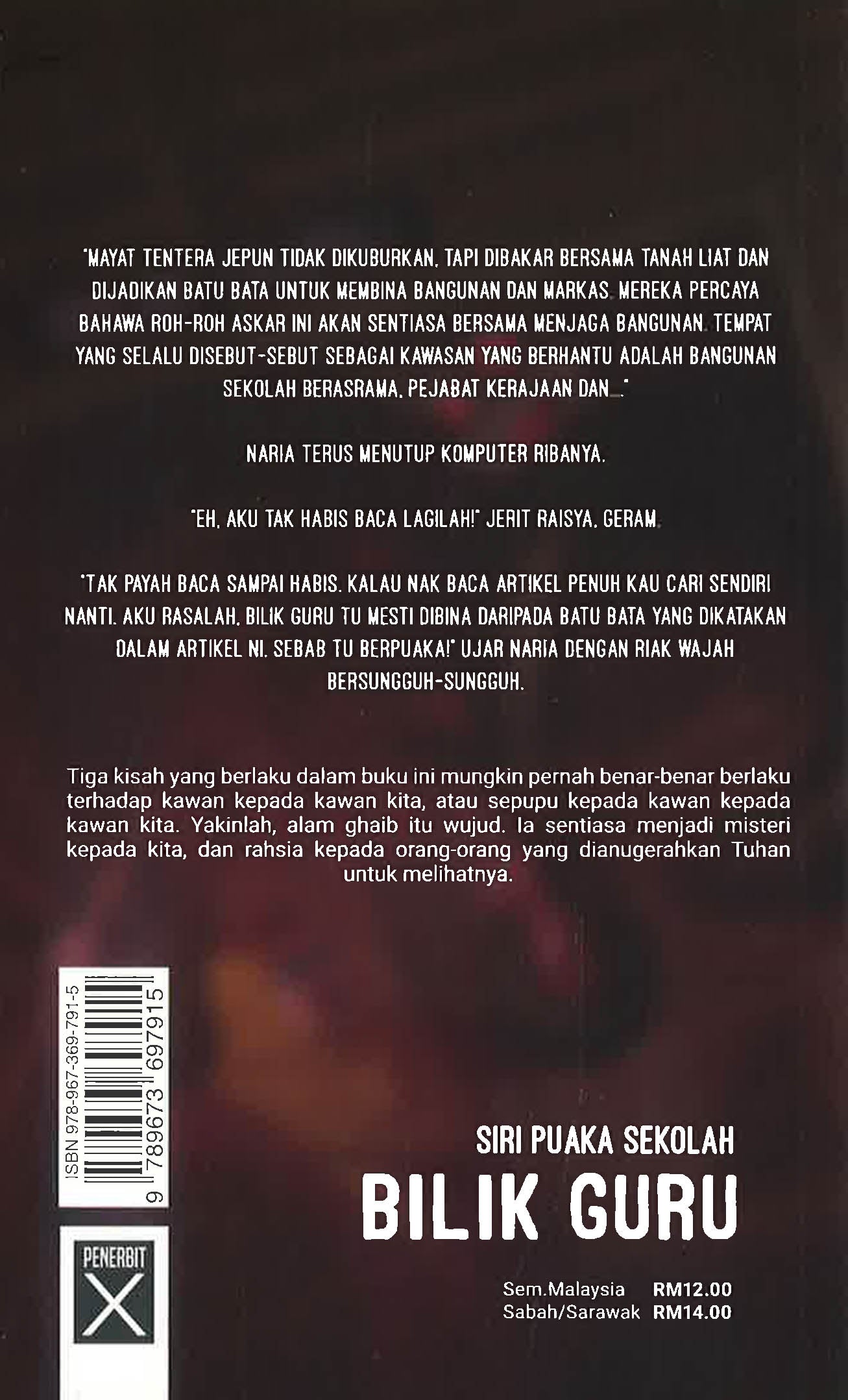 “Mayat tentera Jepun tidak dikuburkan, tapi dibakar bersama tanah liat dan dijadikan batu bata untuk membina bangunan dan markas. Mereka percaya bahawa roh-roh askar ini akan sentiasa bersama menjaga bangunan. Tempat yang selalu disebut-sebut sebagai kawasan yang berhantu adalah bangunan sekolah berasrama, pejabat kerajaan dan….†Naria terus menutup komputer ribanya. “Eh, aku tak habis baca lagilah!†jerit Raisya, geram. “Tak payah baca sampai habis. Kalau nak baca artikel penuh kau cari sendiri nanti. Aku rasalah, bilik guru tu mesti dibina daripada batu bata yang dikatakan dalam artikel ni. Sebab tu berpuaka!†ujar Naria dengan riak wajah bersungguh-sungguh. * * * * * Tiga kisah yang berlaku dalam buku ini mungkin pernah benar-benar berlaku terhadap kawan kepada kawan kita, atau sepupu kepada kawan kepada kawan kita. Yakinlah, alam ghaib itu wujud. Ia sentiasa menjadi misteri kepada kita, dan rahsia kepada orang-orang yang dianugerahkan Tuhan untuk melihatnya.