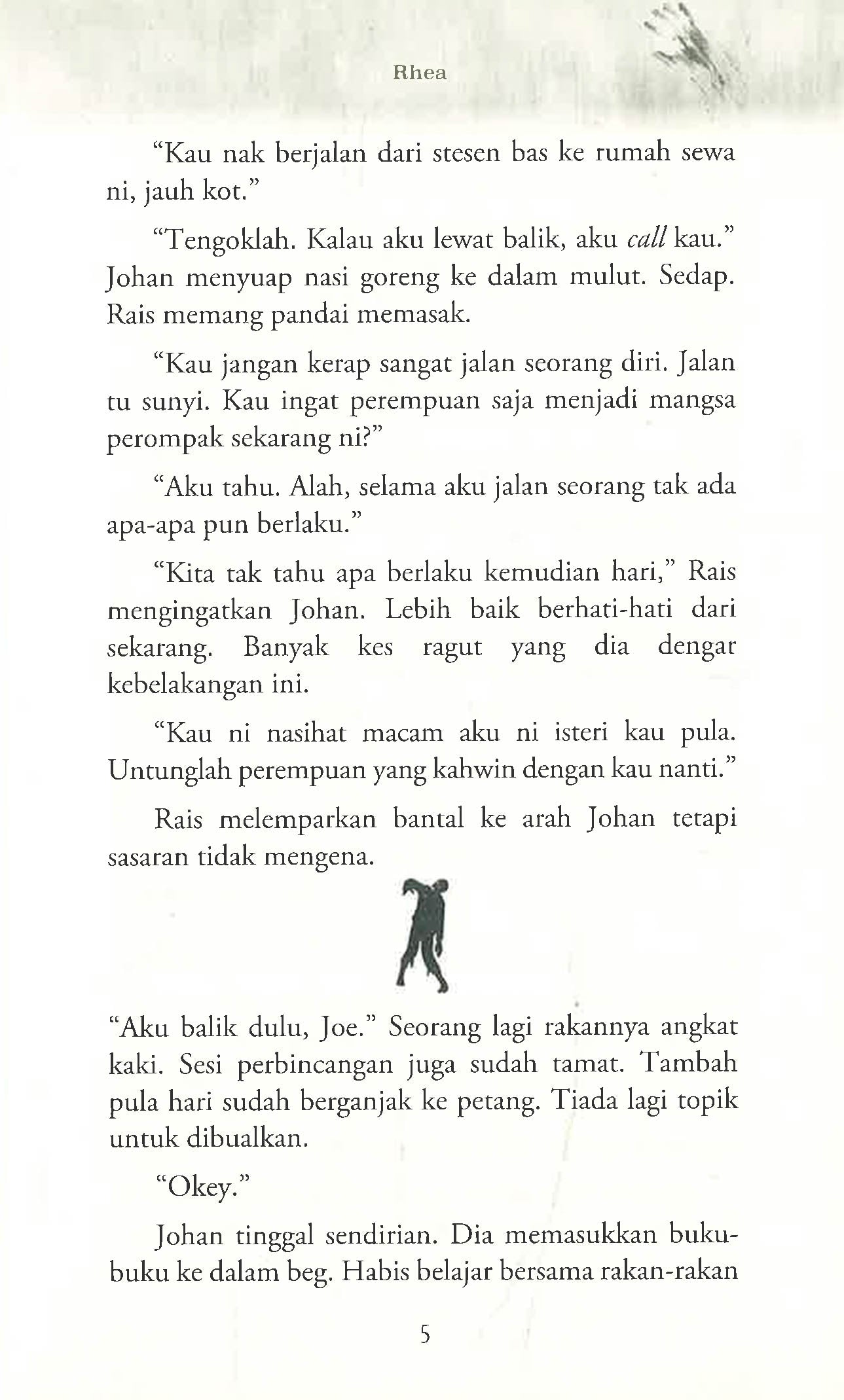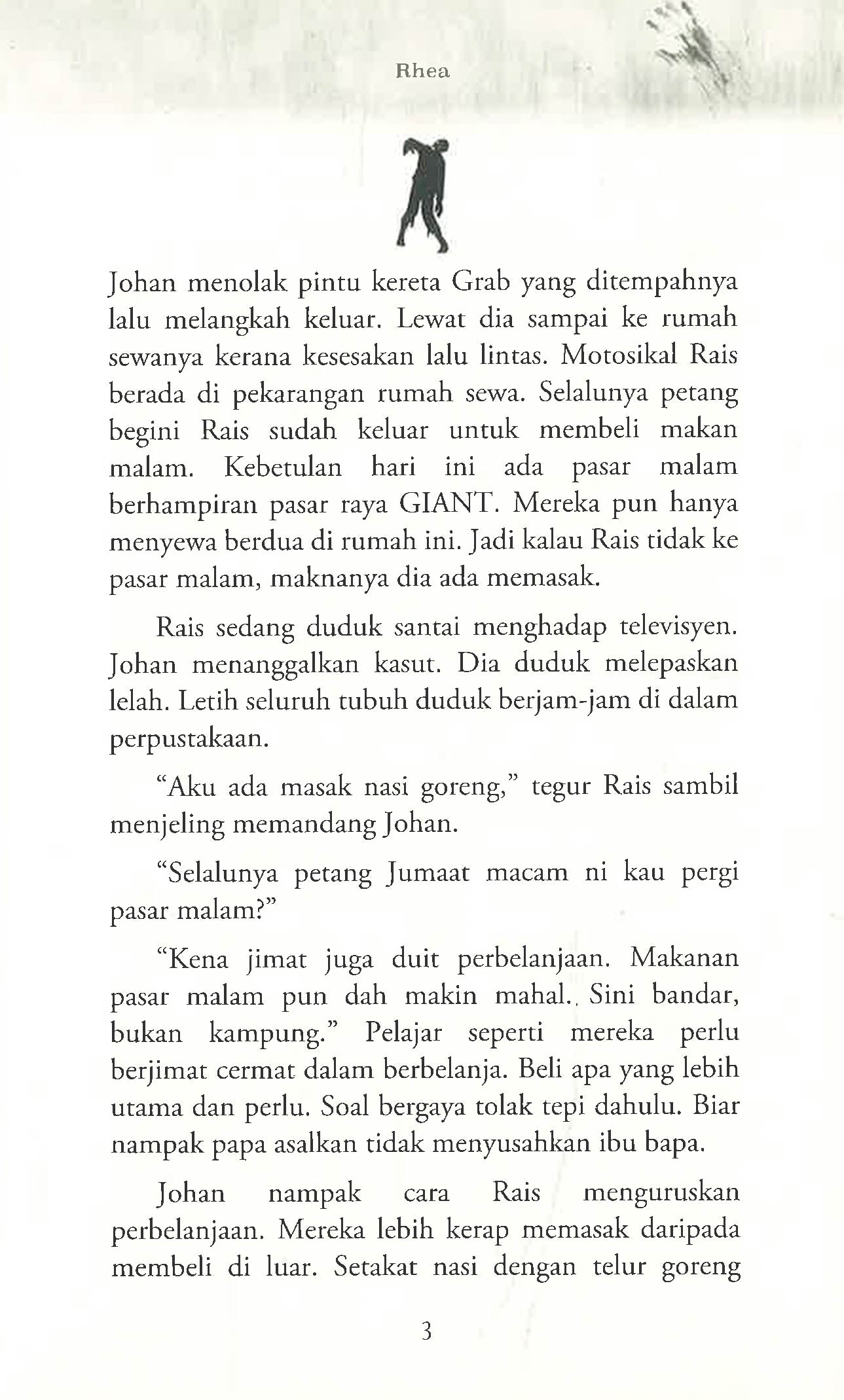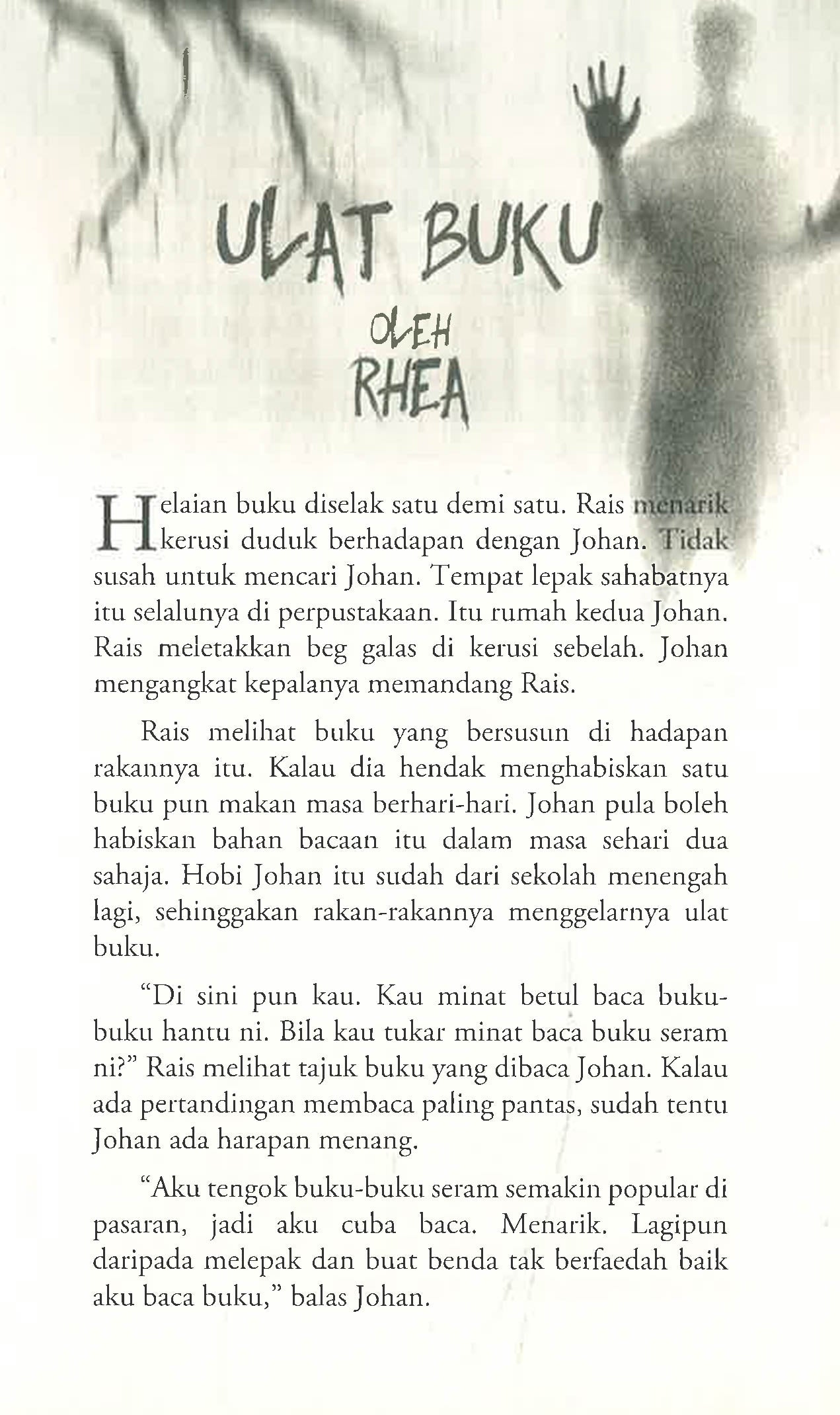 “Abang… tolong kutipkan tangan saya,†ujar budak perempuan itu. Dia menadah sebelah tangannya meminta Johan menghulurkan tangannya yang sebelah lagi itu. Terkocoh-kocoh Johan bangun melarikan diri. Terdengar suara budak perempuan itu ketawa melihat Johan terjatuh-jatuh lari dari situ. Dia masih tidak menjumpai pintu keluar dari perpustakaan itu. Hanya rak-rak buku yang tidak putus-putus sahaja yang ada di sekelilingnya. “Kau takkan dapat keluar dari sini, Johan.†Suara Syafiq kedengaran. “Tolong… tolong lepaskan aku!†rayu Johan dengan pandangan meliar ke sana sini. “Kau akan jadi seperti buku-buku di dalam perpustakaan ini, Johan. Kau akan mereput di sini seperti buku-buku ini. Terbiar, terdampar kerana tiada sesiapa lagi yang mahu membaca di perpustakaan! Orang kita malas! Kau akan kekal di dalam perpustakaan ini sampai bila-bila!†“Oi, hantu! Kau tak pernah dengar tanda pagar Malaysia Membaca ke, hah? Orang Malaysia rajin membacalah! Orang kita malas membaca tu cuma mitos!†jerit Johan. Entah kenapa dia berasa jengkel pula mendengar pertuduhan makhluk itu. * * * Tiga kisah yang berlaku dalam buku ini mungkin pernah benar-benar berlaku terhadap kawan kepada kawan kita, atau sepupu kepada kawan kepada kawan kita. Yakinlah, alam ghaib itu wujud. Ia sentiasa menjadi misteri kepada kita, dan rahsia kepada orang-orang yang dianugerahkan Tuhan untuk melihatnya.